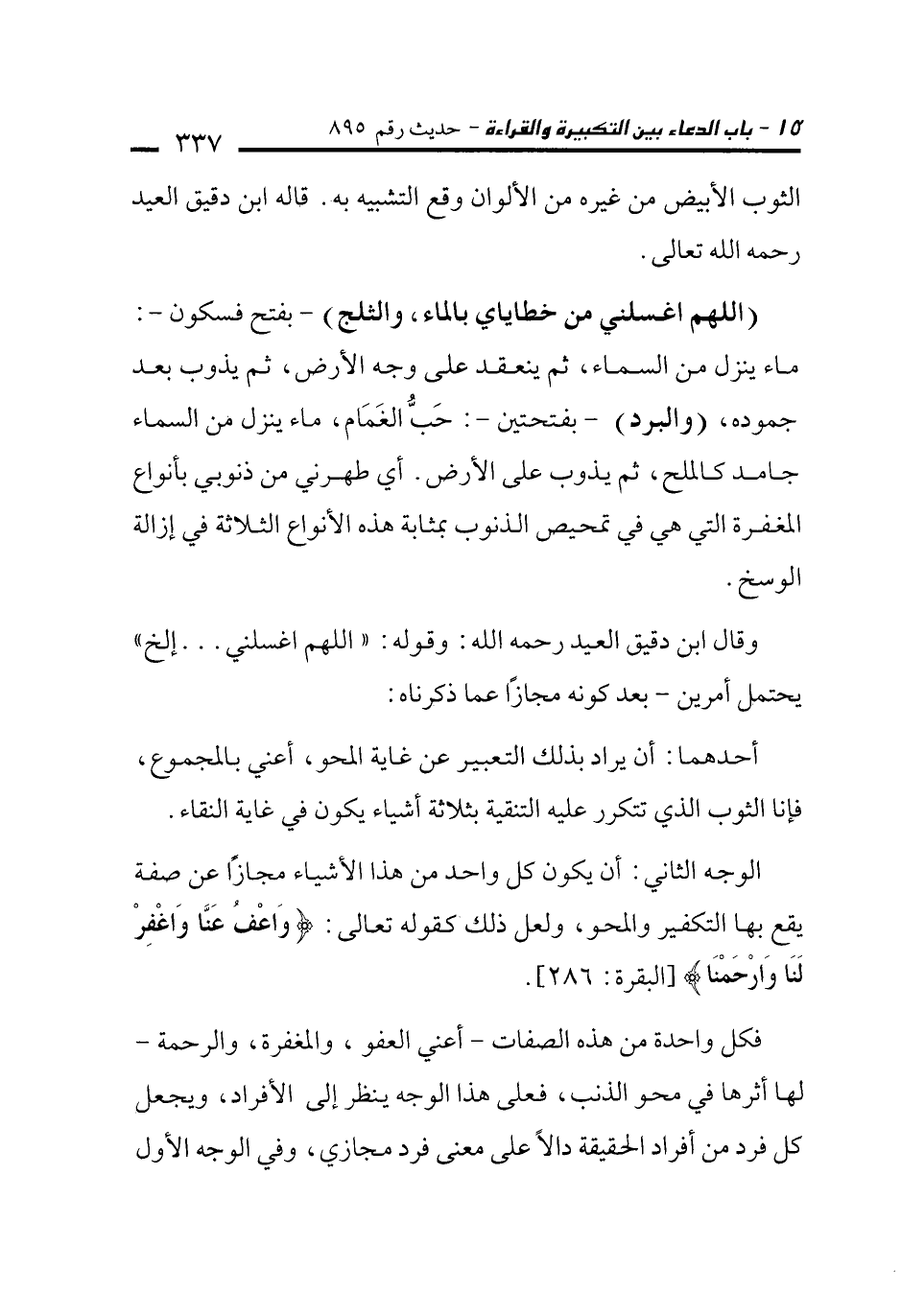 وقال ابن دقيق العيد رحمه الله: وقوله: "اللهم اغسلني ... إلخ" يحتمل أمرين- بعد كونه مجازًا عما ذكرناه: