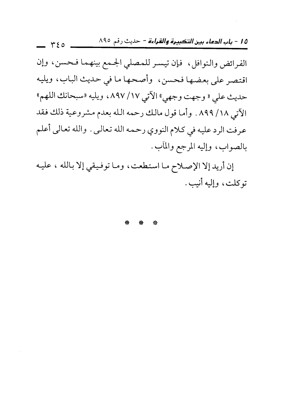 الفرائض والنوافل، فإن تيسر للمصلي الجمع بينهما فحسن، وإن اقتصر على بعضها فحسن، وأصحها ما في حديث الباب، ويليه حديث علي "وجهت وجهي" الآتي 17/ 897، ويليه "سبحانك اللهم" الآتي 18/ 899. وأما قول مالك رحمه الله بعدم مشروعية ذلك فقد عرفت الرد عليه في كلام النووي رحمه الله تعالى. والله تعالى أعلم بالصواب، وإليه المرجع والمآب.