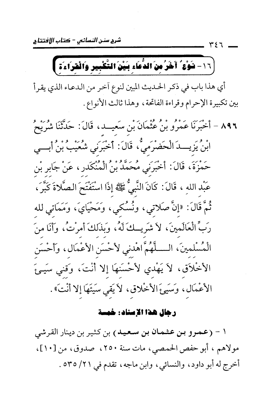 896 - أَخْبَرَنَا عَمْرُو بْنُ عُثْمَانَ بْنِ سَعِيدٍ، قَالَ: حَدَّثَنَا شُرَيْحُ بْنُ يَزِيدَ الْحَضْرَمِيُّ، قَالَ: أَخْبَرَنِي شُعَيْبُ بْنُ أَبِي حَمْزَةَ، قَالَ: أَخْبَرَنِي مُحَمَّدُ بْنُ الْمُنْكَدِرِ، عَنْ جَابِرِ بْنِ عَبْدِ اللَّهِ، قَالَ: كَانَ النَّبِيُّ - صلى الله عليه وسلم - إِذَا اسْتَفْتَحَ الصَّلاَةَ كَبَّرَ، ثُمَّ قَالَ: "إِنَّ صَلاَتِي، وَنُسُكِي، وَمَحْيَايَ، وَمَمَاتِي لِلَّهِ رَبِّ الْعَالَمِينَ، لاَ شَرِيكَ لَهُ، وَبِذَلِكَ أُمِرْتُ، وَأَنَا مِنَ الْمُسْلِمِينَ، اللَّهُمَّ اهْدِنِي لأَحْسَنِ الأَعْمَالِ، وَأَحْسَنِ الأَخْلاَقِ، لاَ يَهْدِي لأَحْسَنِهَا إِلاَّ أَنْتَ، وَقِنِي سَيِّئَ الأَعْمَال، وَسَيِّئَ الأَخْلاَقِ، لاَ يَقِى سَيِّئَهَا إِلاَّ أَنْتَ".