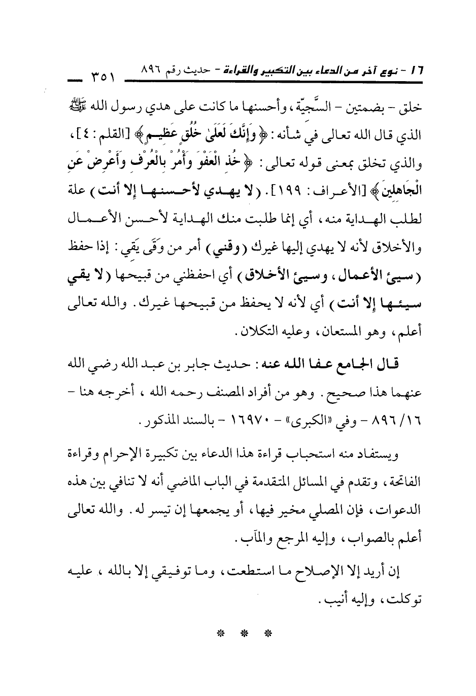 ويستفاد منه استحباب قراءة هذا الدعاء بين تكبيرة الإحرام وقراءة الفاتحة، وتقدم في المسائل المتقدمة في الباب الماضي أنه لا تنافي بين هذه الدعوات، فإن المصلي مخير فيها، أو يجمعها إن تيسر له. والله تعالى أعلم بالصواب، وإليه المرجع والمآب.