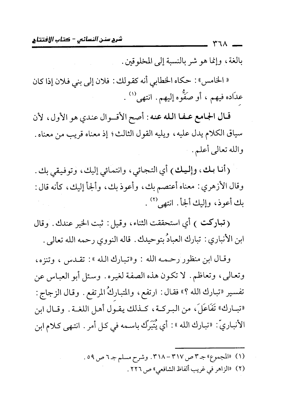 وقال الأزهري: معناه أعتصم بك، وأعوذ بك، وألجأ إليك، كأنه قال: بك أعوذ، وإليك ألجأ. انتهى (¬2).