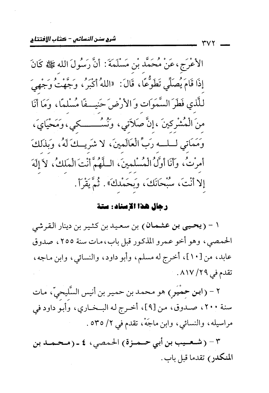الأَعْرَجِ، عَنْ مُحَمَّدِ بْنِ مَسْلَمَةَ: أَنَّ رَسُولَ اللَّهِ - صلى الله عليه وسلم - كَانَ إِذَا قَامَ يُصَلِّي تَطَوُّعًا، قَالَ: "اللَّهُ أَكْبَرُ، وَجَّهْتُ وَجْهِيَ لِلَّذِي فَطَرَ السَّمَوَاتِ وَالأَرْضَ حَنِيفًا مُسْلِمًا، وَمَا أَنَا مِنَ الْمُشْرِكِينَ، إِنَّ صَلاَتِي، وَنُسُكِي، وَمَحْيَايَ، وَمَمَاتِي لِلَّهِ رَبِّ الْعَالَمِينَ، لاَ شَرِيكَ لَهُ، وَبِذَلِكَ أُمِرْتُ، وَأَنَا أَوَّلُ الْمُسْلِمِينَ، اللَّهُمَّ أَنْتَ الْمَلِكُ، لاَ إِلَهَ إِلاَّ أَنْتَ، سُبْحَانَكَ، وَبِحَمْدِكَ". ثُمَّ يَقْرَأُ.