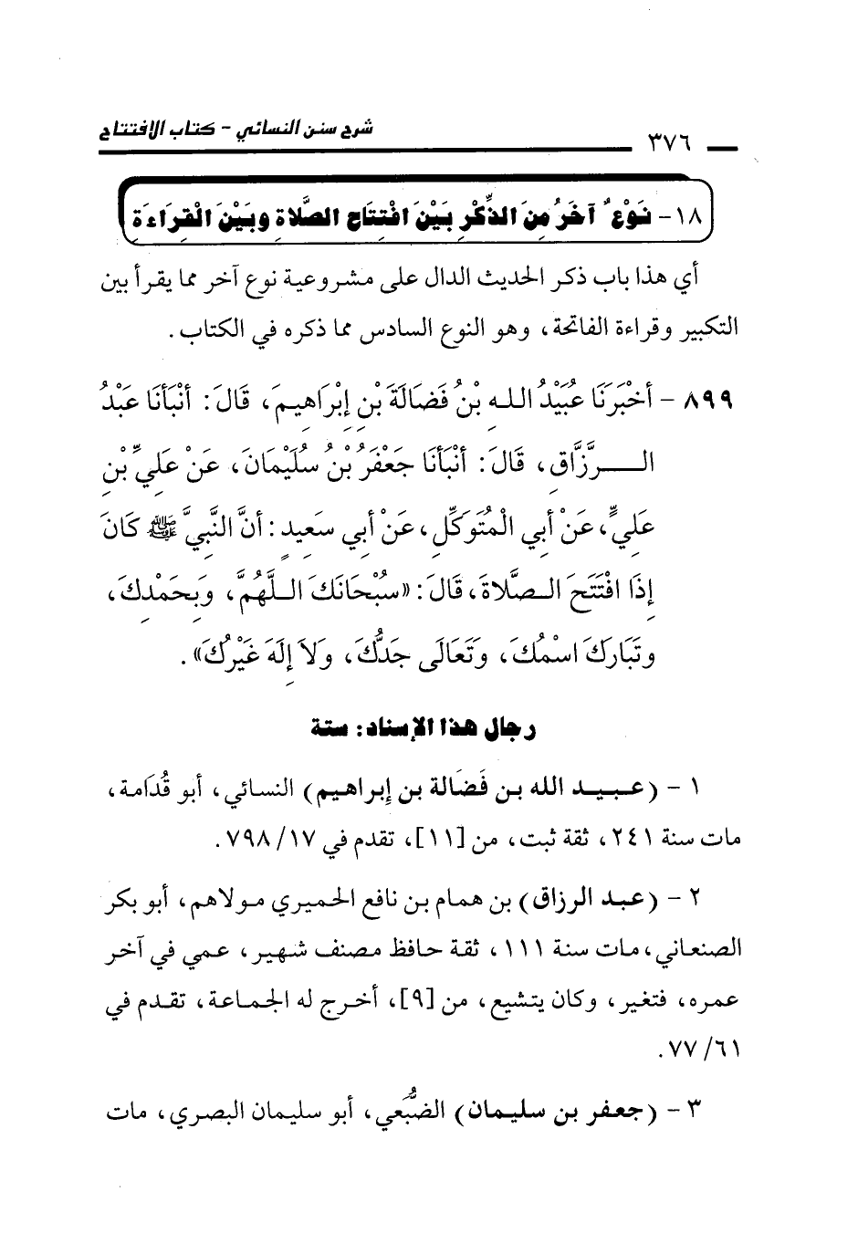 899 - أَخْبَرَنَا عُبَيْدُ اللَّهِ بْنُ فَضَالَةَ بْنِ إِبْرَاهِيمَ، قَالَ: أَنْبَأَنَا عَبْدُ الرَّزَّاقِ، قَالَ: أَنْبَأَنَا جَعْفَرُ بْنُ سُلَيْمَانَ، عَنْ عَلِيِّ بْنِ عَلِيٍّ، عَنْ أَبِي الْمُتَوَكِّلِ، عَنْ أَبِي سَعِيدٍ: أَنَّ النَّبِيَّ - صلى الله عليه وسلم - كَانَ إِذَا افْتَتَحَ الصَّلاَةَ، قَالَ: "سُبْحَانَكَ اللَّهُمَّ وَبِحَمْدِكَ تَبَارَكَ اسْمُكَ، وَتَعَالَى جَدُّكَ، وَلاَ إِلَهَ غَيْرُكَ".