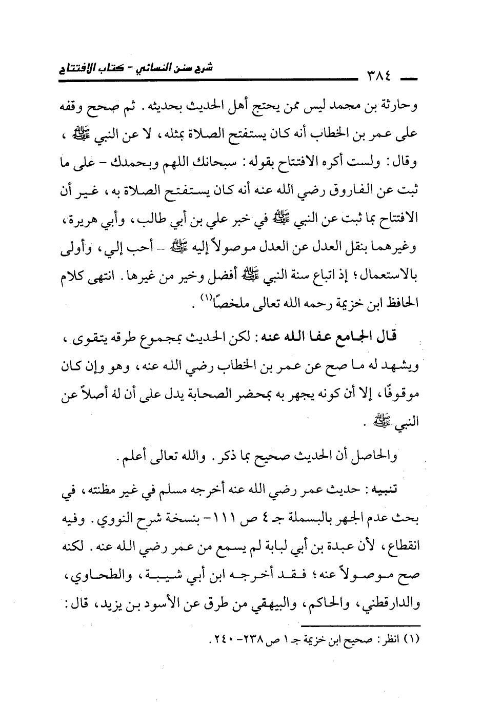 وحارثة بن محمد ليس ممن يحتج أهل الحديث بحديثه. ثم صحح وقفه على عمر بن الخطاب أنه كان يستفتح الصلاة بمثله، لا عن النبي - صلى الله عليه وسلم -، وقال: ولست أكره الافتتاح بقوله: سبحانك اللهم وبحمدك -على ما ثبت عن الفاروق رضي الله عنه أنه كان يستفتح الصلاة به، غير أن الافتتاح بما ثبت عن النبي - صلى الله عليه وسلم - في خبر علي بن أبي طالب، وأبي هريرة، وغيرهما بنقل العدل عن العدل موصولاً إليه - صلى الله عليه وسلم -- أحب إلي، وأولى بالاستعمال، إذ اتباع سنة النبي - صلى الله عليه وسلم - أفضل وخير من غيرها. انتهى كلام الحافظ ابن خزيمة رحمه الله تعالى ملخصًا (¬1).
