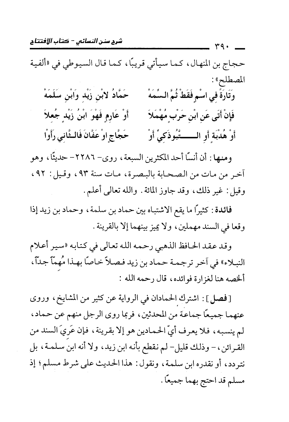 [فصل]: اشترك الحمادان في الرواية عن كثير من المشايخ، وروى عنهما جميعًا جماعة من المحدثين، فربما روى الرجل منهم عن حماد، لم ينسبه، فلا يعرف أيّ الحمادين هو إلا بقرينة، فإن عَرِيَ السند من القرائن، -وذلك قليل- لم نقطع بأنه ابن زيد، ولا أنه ابن سلمة، بل نتردد، أو نقدره ابن سلمة، ونقول: هذا الحديث على شرط مسلم؛ إذ مسلم قد احتج بهما جميعًا.