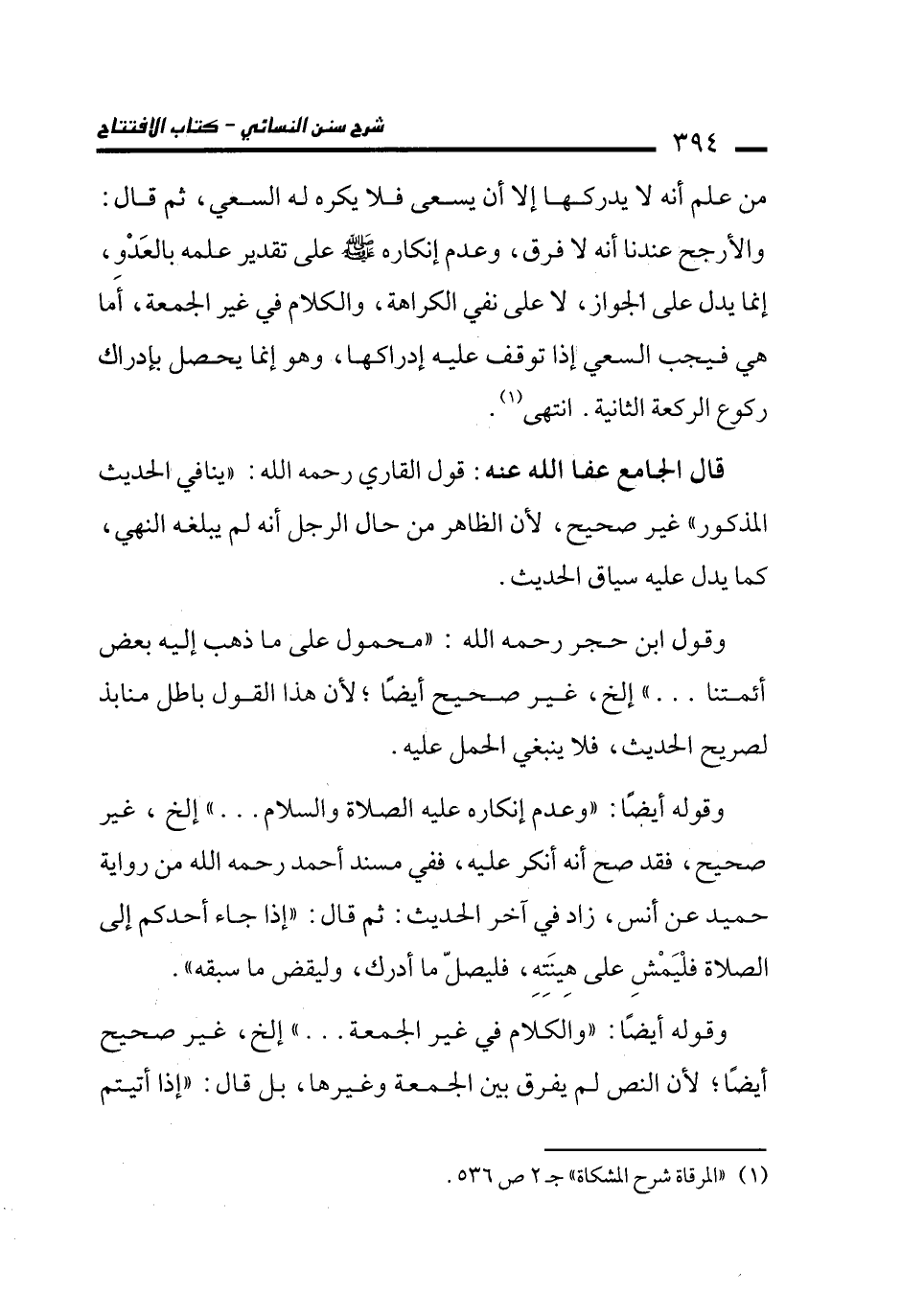 وقوله أيضًا: "وعدم إنكاره عليه الصلاة والسلام ... " إلخ، غير صحيح، فقد صح أنه أنكر عليه، ففي مسند أحمد رحمه الله من رواية حميد عن أنس، زاد في آخر الحديث: ثم قال: "إذا جاء أحدكم إلى الصلاة فلْيَمْشِ على هِينَتِهِ، فليصلّ ما أدرك، وليقض ما سبقه".
