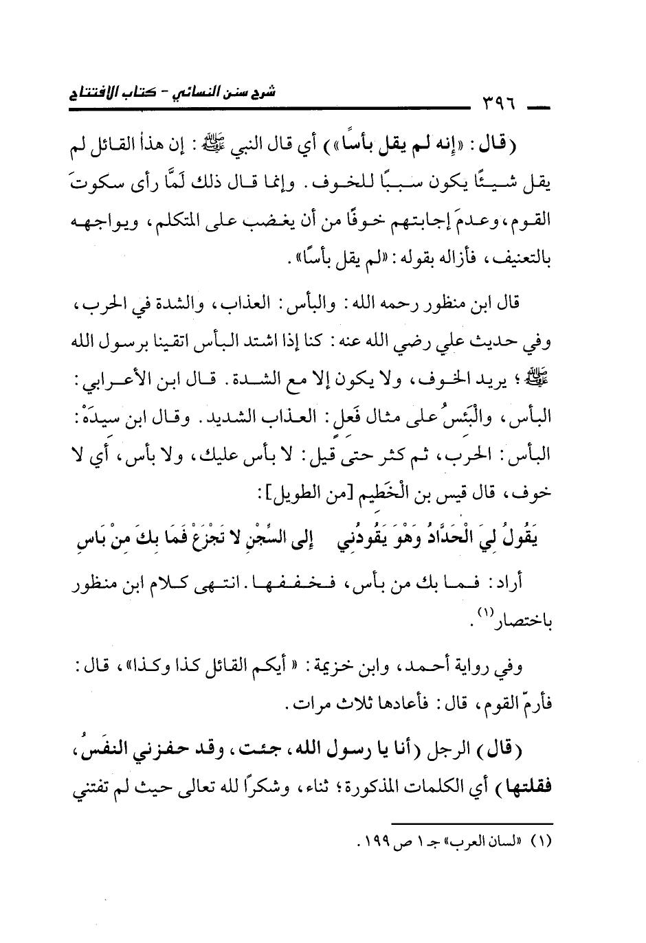 (قال: "إِنه لم يقل بأسًا") أي قال النبي - صلى الله عليه وسلم -: إن هذا القائل لم يقل شيئًا يكون سببًا للخوف. وإنما قال ذلك لَمَّا رأى سكوتَ القوم، وعدمَ إجابتهم خوفًا من أن يغضب على المتكلم، ويواجهه بالتعنيف، فأزاله بقوله: "لم يقل بأسًا".