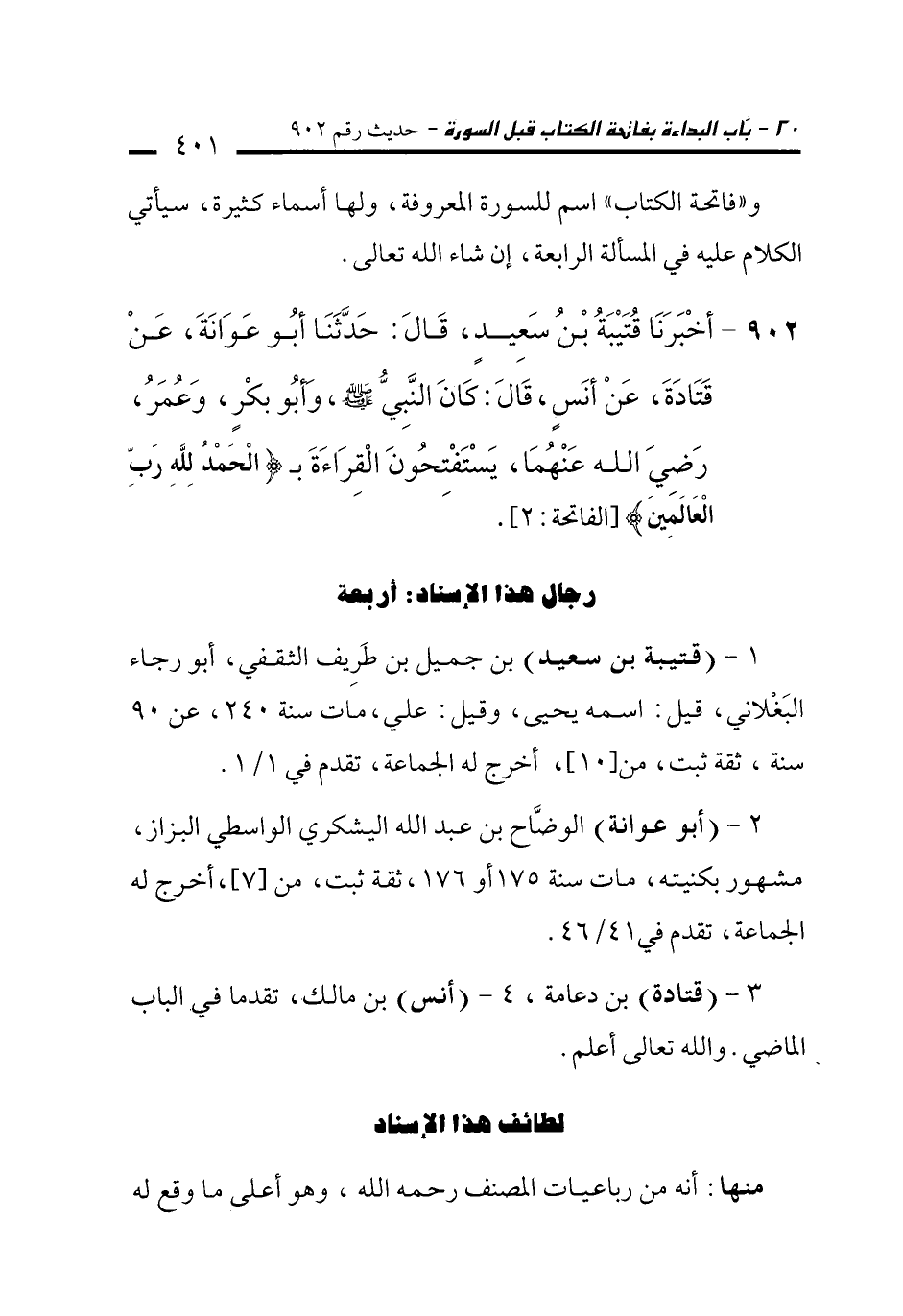 902 - أَخْبَرَنَا قُتَيْبَةُ بْنُ سَعِيدٍ، قَالَ: حَدَّثَنَا أَبُو عَوَانَةَ، عَنْ قَتَادَةَ، عَنْ أَنَسٍ، قَالَ: كَانَ النَّبِيُّ - صلى الله عليه وسلم -، وَأَبُو بَكْرٍ، وَعُمَرُ رَضِيَ اللهُ عَنْهُمَا، يَسْتَفْتِحُونَ الْقِرَاءَةَ بـ {الْحَمْدُ لِلَّهِ رَبِّ الْعَالَمِينَ (2)} [الفاتحة: 2].
