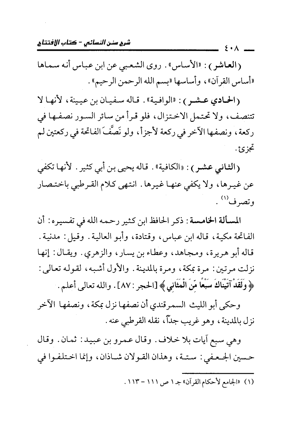 المسألة الخامسة: ذكر الحافظ ابن كثير رحمه الله في تفسيره: أن الفاتحة مكية، قاله ابن عباس، وقتادة، وأبو العالية. وقيل: مدنية. قاله أبو هريرة، ومجاهد، وعطاء بن يسار، والزهري. ويقال: إنها نزلت مرتين: مرة بمكة، ومرة بالمدينة. والأول أشبه، لقوله تعالى: {وَلَقَدْ آتَيْنَاكَ سَبْعًا مِنَ الْمَثَانِي} [الحجر: 87]. والله تعالى أعلم.