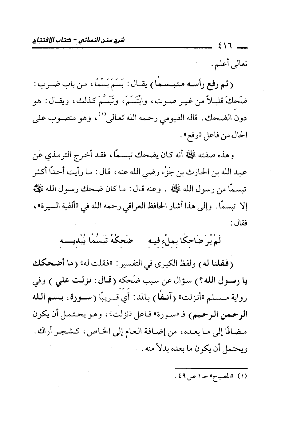 (ثم رفع رأسه متبسمًا) يقال: بَسَمَ بَسْمًا، من باب ضرب: ضَحكَ قليلًا من غير صوت، وابْتَسَمَ، وتَبَسَّمَ كذلك، ويقال: هو دونَ الضحك. قاله الفيومي رحمه الله تعالى (¬1)، وهو منصوب على الحال من فاعل "رفع".