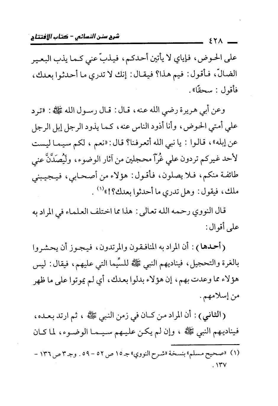 (الثاني): أن المراد من كان في زمن النبي - صلى الله عليه وسلم -، ثم ارتد بعده، فيناديهم النبي - صلى الله عليه وسلم -، وإن لم يكن عليهم سيما الوضوء، لما كان