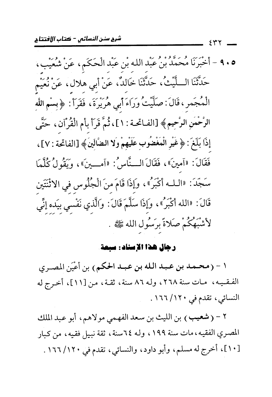 905 - أَخْبَرَنَا مُحَمَّدُ بْنُ عَبْدِ اللَّهِ بْنِ عَبْدِ الْحَكَمِ، عَنْ شُعَيْبٍ، حَدَّثَنَا اللَّيْثُ، حَدَّثَنَا خَالِدٌ، عَنِ ابْنِ أَبِي هِلاَلٍ، عَنْ نُعَيْمٍ الْمُجْمِرِ، قَالَ: صَلَّيْتُ وَرَاءَ أَبِي هُرَيْرَةَ، فَقَرَأَ: {بِسْمِ اللَّهِ الرَّحْمَنِ الرَّحِيمِ (1)} [الفاتحة: 1]، ثُمَّ قَرَأَ بِأُمِّ الْقُرْآنِ، حَتَّى إِذَا بَلَغَ: {غَيْرِ الْمَغْضُوبِ عَلَيْهِمْ وَلَا الضَّالِّينَ} [الفاتحة: 7]، فَقَالَ: "آمِينَ". فَقَالَ النَّاسُ: "آمِينَ"، وَيَقُولُ كُلَّمَا سَجَدَ: "اللَّهُ أَكْبَرُ"، وَإِذَا قَامَ مِنَ الْجُلُوسِ فِي الاِثْنَيْنِ، قَالَ: "اللهُ أَكْبَرُ"، وَإِذَا سَلَّمَ قَالَ: وَالَّذِي نَفْسِي بِيَدِهِ إِنِّي لأَشْبَهُكُمْ صَلاَةً بِرَسُولِ اللَّهِ - صلى الله عليه وسلم -.