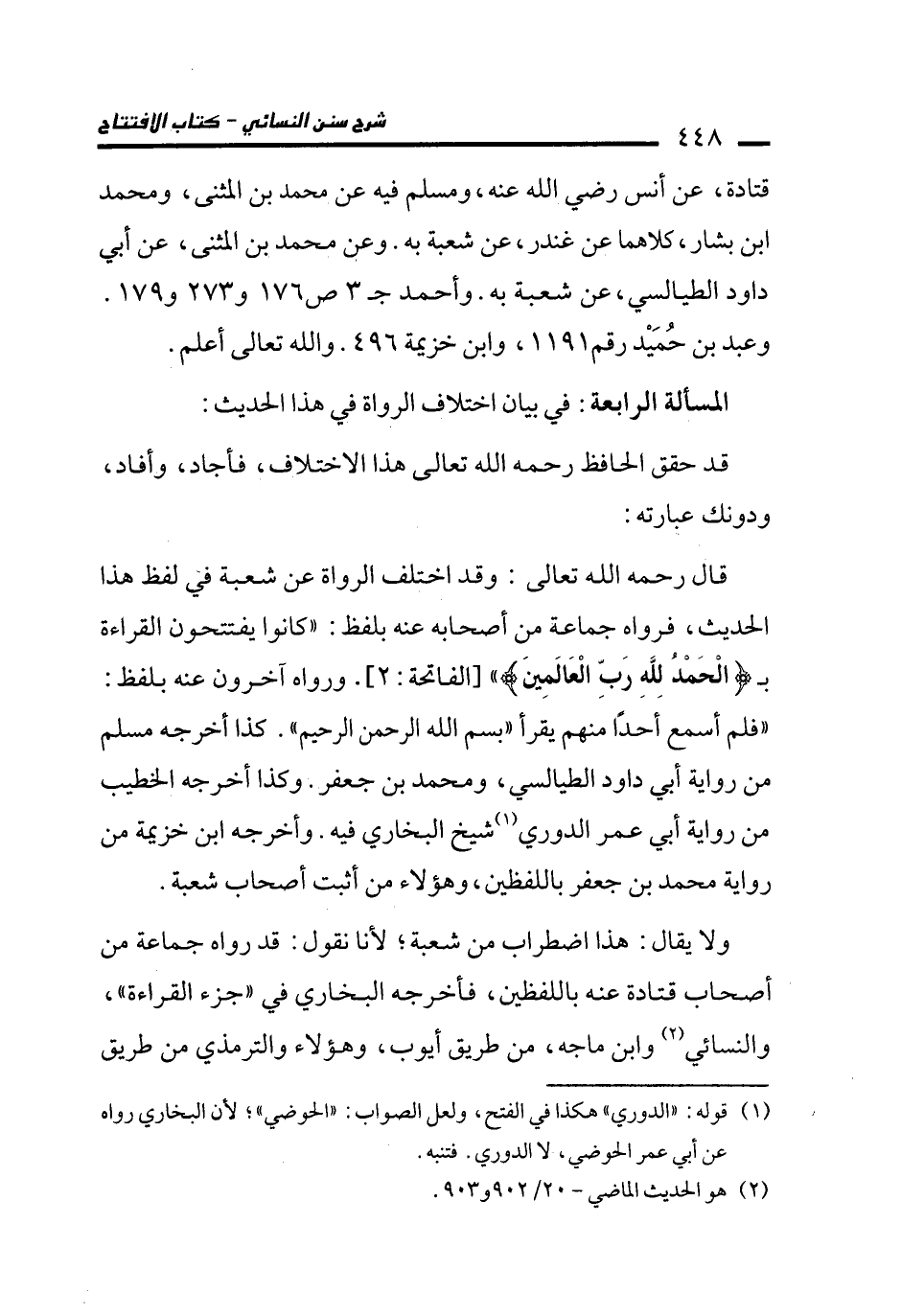 قال رحمه الله تعالى: وقد اختلف الرواة عن شعبة في لفظ هذا الحديث، فرواه جماعة من أصحابه عنه بلفظ: "كانوا يفتتحون القراءة بـ {الْحَمْدُ لِلَّهِ رَبِّ الْعَالَمِينَ} [الفاتحة: 2]. ورواه آخرون عنه بلفظ: "فلم أسمع أحدًا منهم يقرأ "بسم الله الرحمن الرحيم". كذا أخرجه مسلم من رواية أبي داود الطيالسي، ومحمد بن جعفر. وكذا أخرجه الخطيب من رواية أبي عمر الدوري (¬1) شيخ البخاري فيه. وأخرجه ابن خزيمة من رواية محمد بن جعفر باللفظين، وهؤلاء من أثبت أصحاب شعبة.