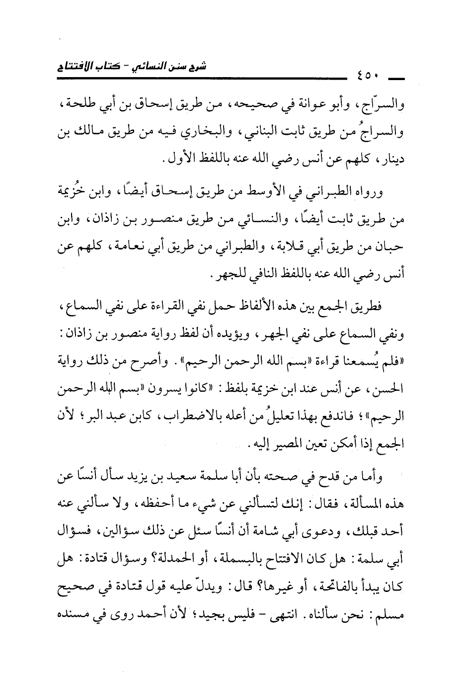 فطريق الجمع بين هذه الألفاظ حمل نفي القراءة على نفي السماع، ونفي السماع على نفي الجهر، ويؤيده أن لفظ رواية منصور بن زاذان: "فلم يُسمعنا قراءة "بسم الله الرحمن الرحيم". وأصرح من ذلك رواية الحسن، عن إنس عند ابن خزيمة بلفظ: "كانوا يسرون "بسم الله الرحمن الرحيم"؛ فاندفع بهذا تعليلُ من أعله بالاضطراب، كابن عبد البر؛ لأن الجمع إذا أمكن تعين المصير إليه.