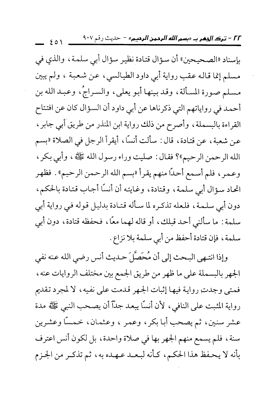 بإسناد "الصحيحين" أن سؤال قتادة نظير سؤال أبي سلمة، والذي في مسلم إنما قاله عقب رواية أبي داود الطيالسي، عن شعبة، ولم يبين مسلم صورة المسألة، وقد بينها أبو يعلى، والسراجُ، وعبد الله بن أحمد في رواياتهم التي ذكرناها عن أبي داود أن السؤال كان عن افتتاح القراءة بالبسملة، وأصرح من ذلك رواية ابن المنذر من طريق أبي جابر، عن شعبة، عن قتادة، قال: سألت أنسًا، أيقرأ الرجل في الصلاة "بسم الله الرحمن الرحيم"؟ فقال: صليت وراء رسول الله - صلى الله عليه وسلم -، وأبي بكر، وعمر، فلم أسمع أحدًا منهم يقرأ "بسم الله الرحمن الرحيم". فظهر اتحاد سؤال أبي سلمة، وقتادة، وغايته أن أنسًا أجاب قتادة بالحكم،