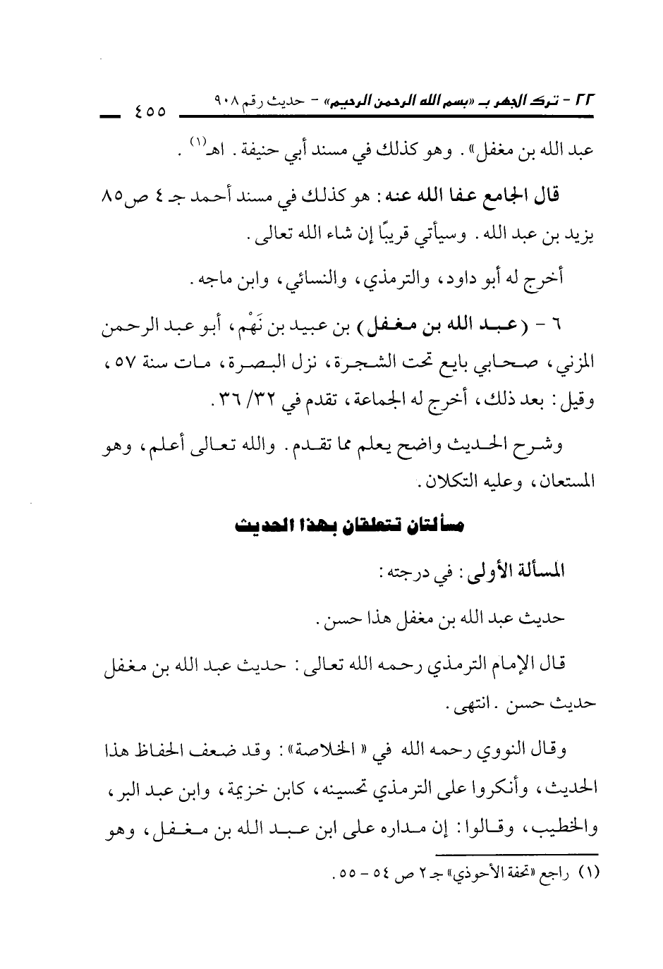 قال الإمام الترمذي رحمه الله تعالى: حديث عبد الله بن مغفل حديث حسن. انتهى.