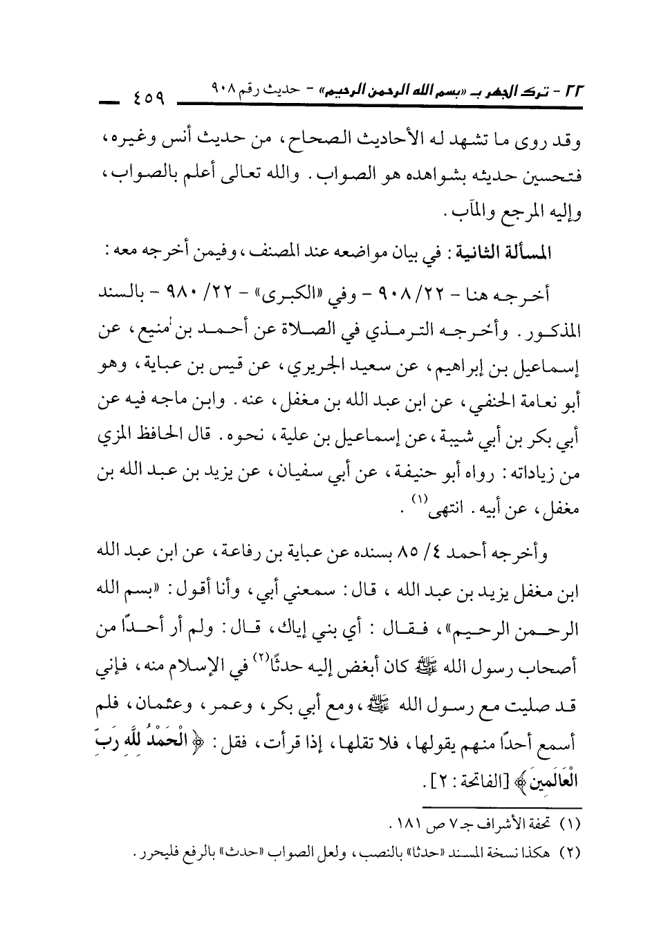 وأخرجه أحمد 4/ 85 بسنده عن عباية بن رفاعة، عن ابن عبد الله ابن مغفل يزيد بن عبد الله، قال: سمعني أبي، وأنا أقول: "بسم الله الرحمن الرحيم"، فقال: أي بني إياك، قال: ولم أر أحدًا من أصحاب رسول الله - صلى الله عليه وسلم - كان أبغض إليه حدثًا (¬2) في الإسلام منه، فإني قد صليت مع رسول الله - صلى الله عليه وسلم -، ومع أبي بكر، وعمر، وعثمان، فلم أسمع أحدًا منهم يقولها، فلا تقلها، إذا قرأت، فقل: {الْحَمْدُ لِلَّهِ رَبِّ الْعَالَمِينَ} [الفاتحة: 2].