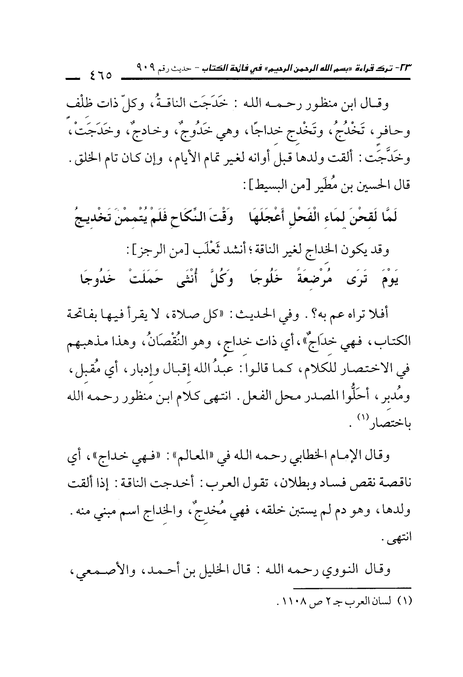 أفلا تراه عم به؟. وفي الحديث: "كل صلاة، لا يقرأ فيها بفاتحة الكتاب، فهي خدَاجٌ"، أي ذات خداجٍ، وهو النُقْصَانُ، وهذا مذهبهم في الاختصار للكلام، كما قالواَ: عبدُ الله إِقبال وإِدبار، أي مُقبِل، ومُدبر، أحَلُّوا المصدر محل الفعل. انتهى كلام ابن منظور رحمه الله باختصار (¬1).