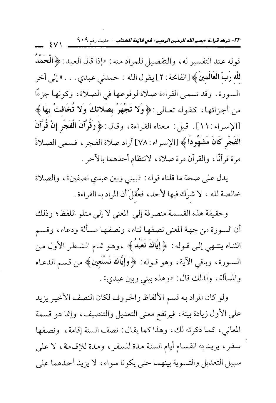 قوله عند التفسير له، والتفصيل للمراد منه: "إذا قال العبد: {الْحَمْدُ لِلَّهِ رَبِّ الْعَالَمِينَ} [الفاتحة: 2] يقول الله: حمدني عبدي ... " إلى آخر السورة. وقد تسمى القراءة صلاة لوقوعها في الصلاة، وكونها جزءًا من أجزائها، كقوله تعالى: {وَلَا تَجْهَرْ بِصَلَاتِكَ وَلَا تُخَافِتْ بِهَا} [الإسراء: 110]. قيل: معناه القراءة، وقال: {وَقُرْآنَ الْفَجْرِ إِنَّ قُرْآنَ الْفَجْرِ كَانَ مَشْهُودًا} [الإسراء: 78] أراد صلاة الفجر، فسمى الصلاة مرة قرآنًا، والقرآن مرة صلاة، لانتظام أحدهما بالآخر.