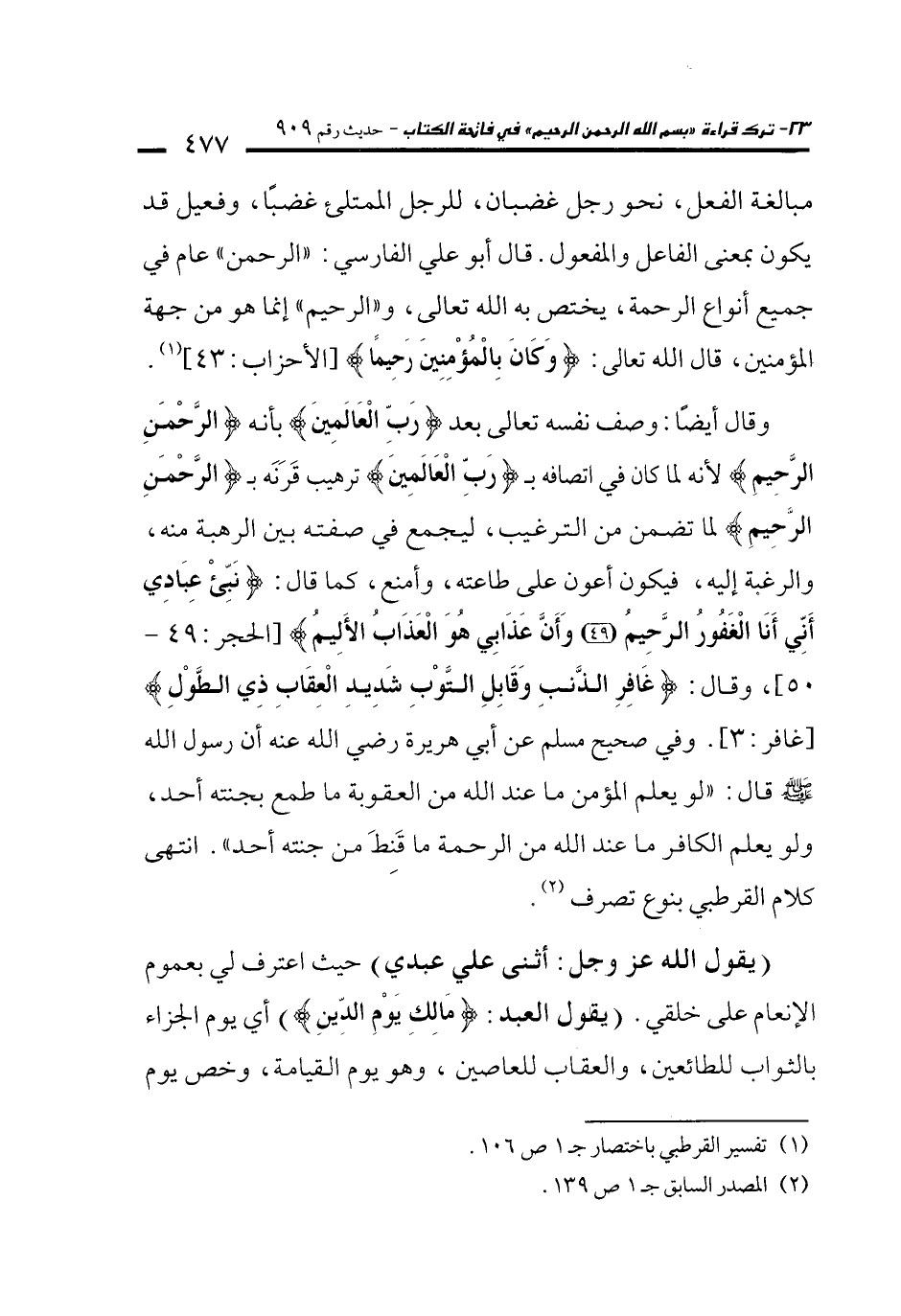 وقال أيضا: وصف نفسه تعالى بعد {رَبِّ الْعَالَمِينَ} بأنه {الرَّحْمَنِ الرَّحِيمِ} لأنه لما كان في اتصافه بـ {رَبِّ الْعَالَمِينَ} ترهيب قَرَنَه بـ {الرَّحْمَنِ الرَحِيمِ} لما تضمن من الترغيب، ليجمع في صفته بين الرهبة منه، والرغبة إليه، فيكون أعون على طاعته، وأمنع، كما قال: {نَبِّئْ عِبَادِي أَنِّي أَنَا الْغَفُورُ الرَّحِيمُ (49) وَأَنَّ عَذَابِي هُوَ الْعَذَابُ الْأَلِيمُ (50)} [الحجر: 49 - 50] , وقال: {غَافِرِ الذَّنْبِ وَقَابِلِ التَّوْبِ شَدِيدِ الْعِقَابِ ذِي الطَّوْلِ} [غافر: 3]. وفي صحيح مسلم عن أبي هريرة رضي الله عنه أن رسول الله - صلى الله عليه وسلم - قال: "لو يعلم المؤمن ما عند الله من العقوبة ما طمع بجنته أحد، ولو يعلم الكافر ما عند الله من الرحمة ما قَنِطَ من جنته أحد". انتهى كلام القرطبي بنوع تصرف (¬2).