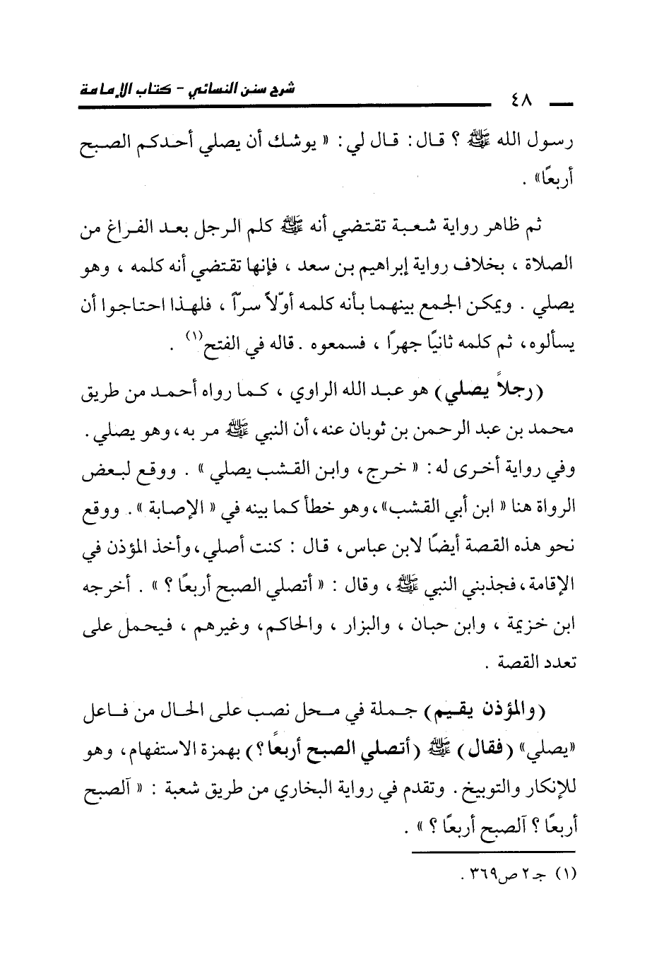 ثم ظاهر رواية شعبة تقتضي أنه -صلى الله عليه وسلم- كلم الرجل بعد الفراغ من الصلاة، بخلاف رواية إبراهيم بن سعد، فإنها تقتضي أنه كلمه، وهو يصلي. ويمكن الجمع بينهما بأنه كلمه أوّلاً سرّاً، فلهذا احتاجوا أن يسألوه، ثم كلمه ثانيًا جهرًا، فسمعوه. قاله في الفتح (¬1).