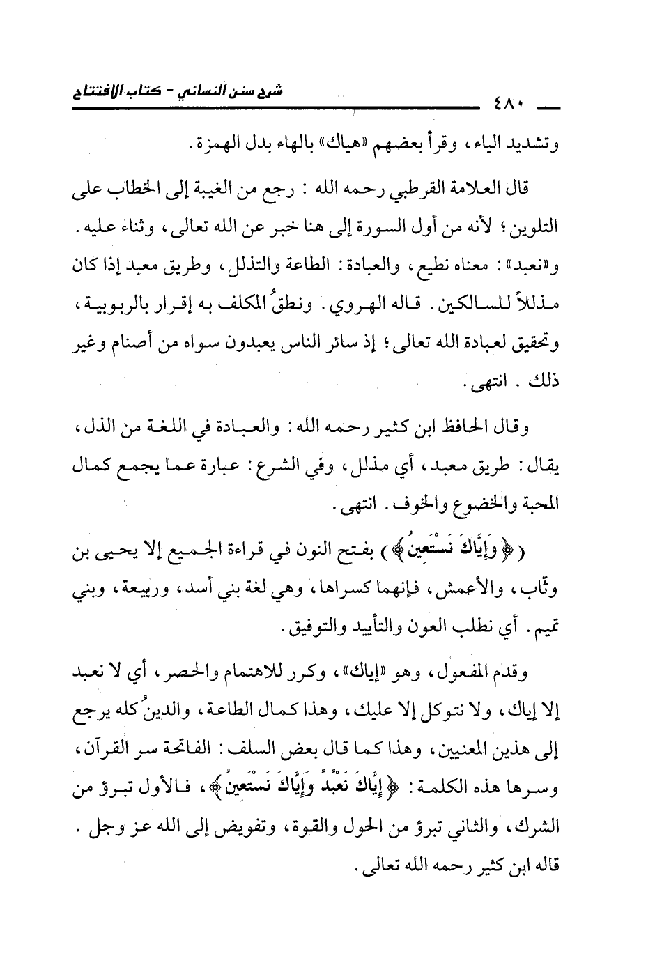 إلى هذين المعنيين، وهذا كما قال بعض السلف: الفاتحة سر القرآن، وسرها هذه الكلمة: {إِيَّاكَ نَعْبُدُ وَإِيَّاكَ نَسْتَعِينُ}، فالأول تبرؤ من الشرك، والثاني تبرؤ من الحول والقوة، وتفويض إلى الله عز وجل. قاله ابن كثير رحمه الله تعالى.
