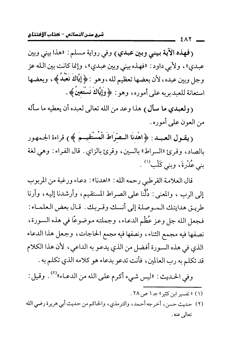 قال العلامة القرطبي رحمه الله: "اهدنا": دعاء ورغبة من المربوب إلى الرب، والمعنى: دُلَّنا على الصراط المستقيم، وأرشدنا إليه، وأرنا طريق هدايتك الموصلة إلى أنسك وقربك. قال بعض العلماء: فجعل الله جل وعز عُظْم الدعاء، وجملته موضوعًا في هذه السورة، نصفها فيه مجمع الثناء، ونصفها فيه مجمع الحاجات، وجعل هذا الدعاء الذي في هذه السورة أفضل من الذي يدعو به الداعي، لأن هذا الكلام قد تكلم به رب العالمين، فأنت تدعو بدعاء هو كلامه الذي تكلم به.