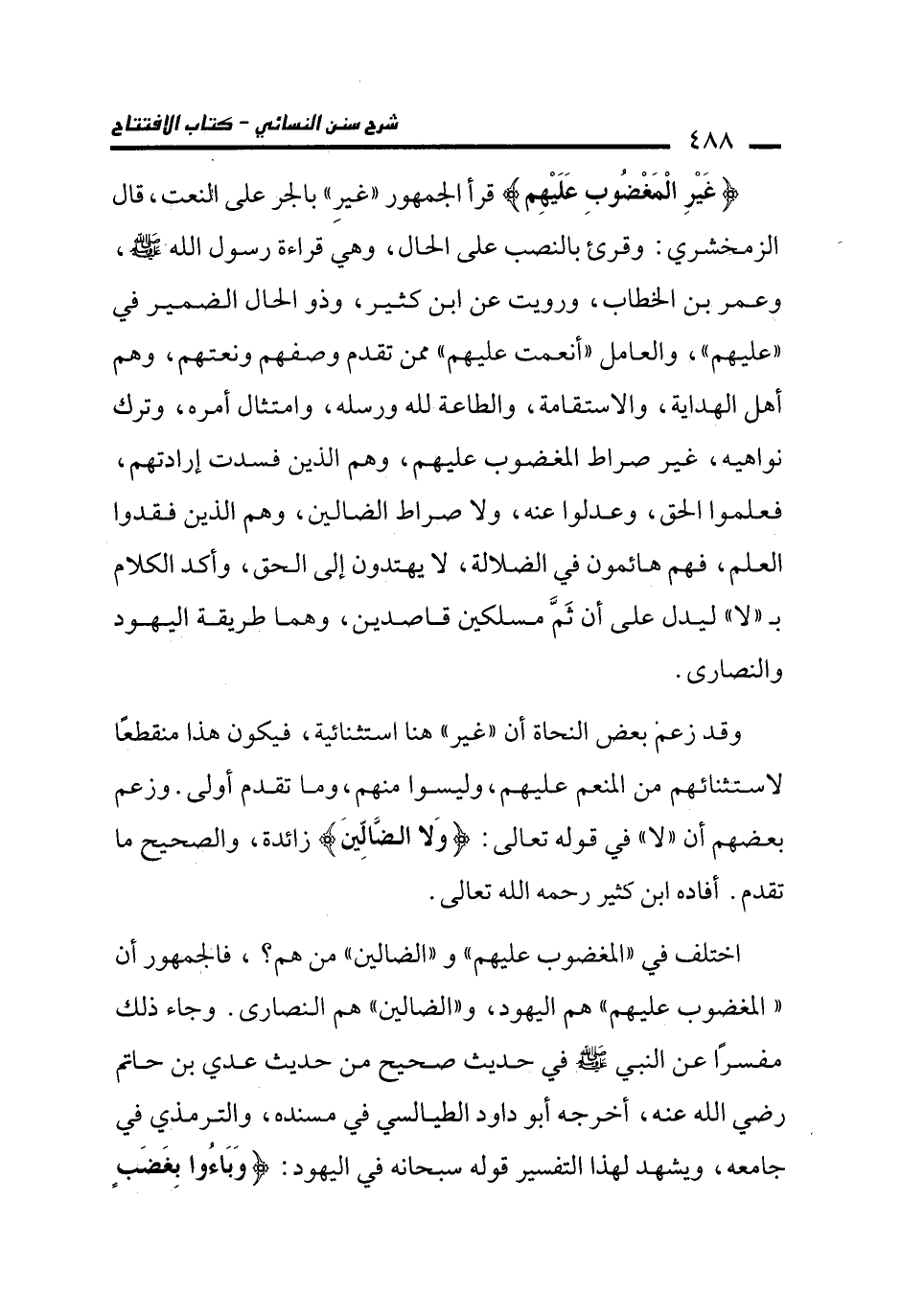 {غَيْرِ الْمَغْضُوبِ عَلَيْهِم} قرأ الجمهور "غيرِ" بالجر على النعت، قال الزمخشري: وقرئ بالنصب على الحال، وهي قراءة رسول الله - صلى الله عليه وسلم -، وعمر بن الخطاب، ورويت عن ابن كثير، وذو الحال الضمير في "عليهم"، والعامل "أنعمت عليهم" ممن تقدم وصفهم ونعتهم، وهم أهل الهداية، والاستقامة، والطاعة لله ورسله، وامتثال أمره، وترك نواهيه، غير صراط المغضوب عليهم، وهم الذين فسدت إرادتهم، فعلموا الحق، وعدلوا عنه، ولا صراط الضالين، وهم الذين فقدوا العلم، فهم هائمون في الضلالة، لا يهتدون إلى الحق، وأكد الكلام بـ "لا" ليدل على أن ثَمَّ مسلكين قاصدين، وهما طريقة اليهود والنصارى.