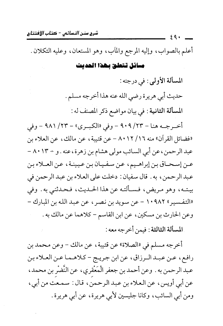 أخرجه هنا -23/ 909 - وفي "الكبرى" -23/ 981 - وفي "فضائل القرآن" منه 16/ 8012 - عن قتيبة، عن مالك، عن العلاء بن عبد الرحمن، عن أبي السائب مولى هشام بن زهرة، عنه. و -8013 - عن إسحاق بن إبراهيم، عن سفيان بن عيينة، عن العلاء بن عبد الرحمن، به. قال سفيان: دخلت على العلاء بن عبد الرحمن في بيته، وهو مريض، فسألته عن هذا الحديث، فحدثني به. وفي "التفسير" 10982 - عن سويد بن نصر، عن عبد الله بن المبارك - وعن الحارث بن مسكين، عن ابن القاسم - كلاهما عن مالك به.