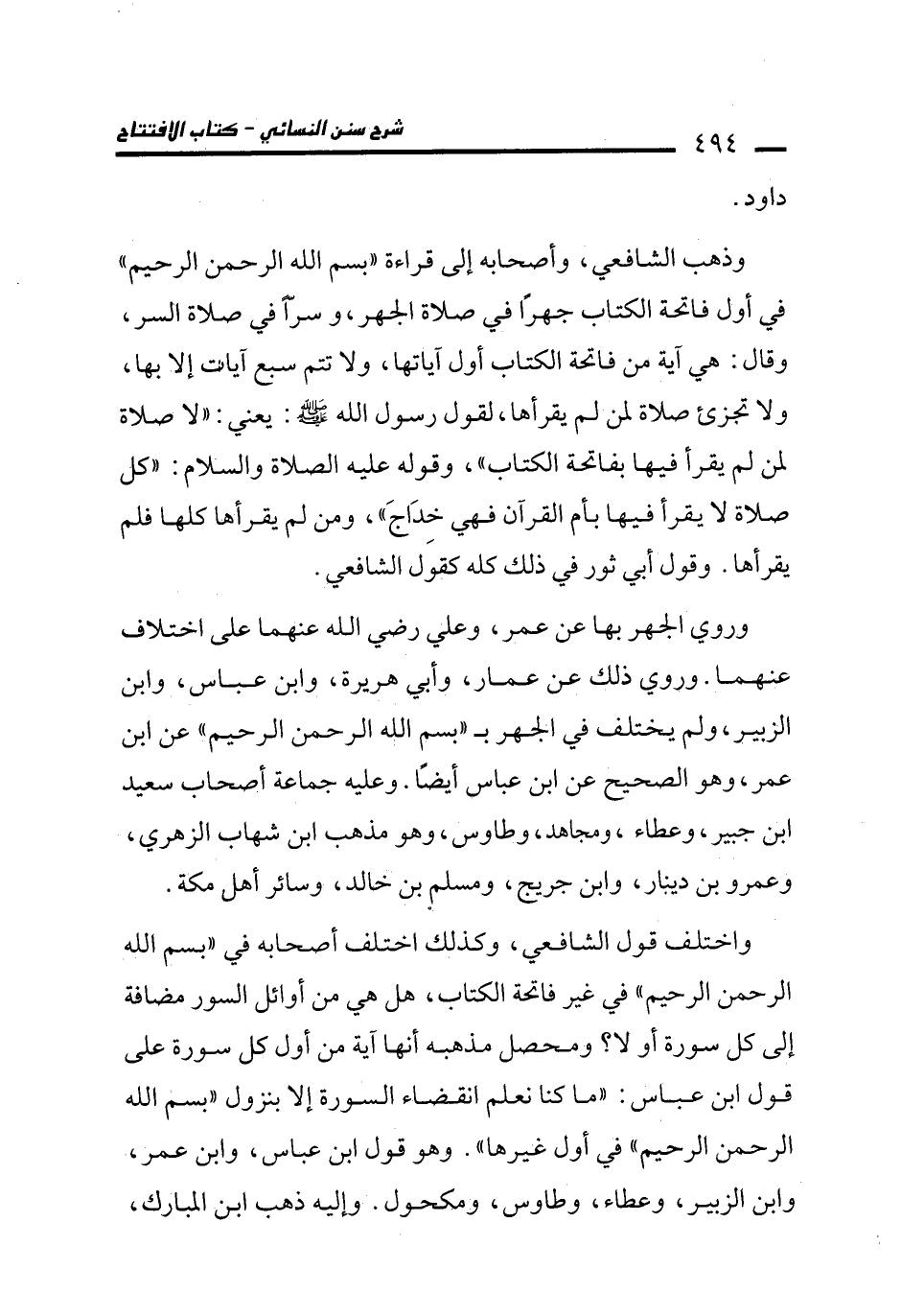 وذهب الشافعي، وأصحابه إلى قراءة "بسم الله الرحمن الرحيم" في أول فاتحة الكتاب جهرًا في صلاة الجهر، وسرًّا في صلاة السر، وقال: هي آية من فاتحة الكتاب أول آياتها، ولا تتم سبع آيات إلا بها، ولا تجزئ صلاة لمن لم يقرأها، لقول رسول الله - صلى الله عليه وسلم -: يعني: "لا صلاة لمن لم يقرأ فيها بفاتحة الكتاب"، وقوله عليه الصلاة والسلام: "كل صلاة لا يقرأ فيها بأم القرآن فهي خِدَاجَ"، ومن لم يقرأها كلها فلم يقرأها. وقول أبي ثور في ذلك كله كقوَل الشافعي.