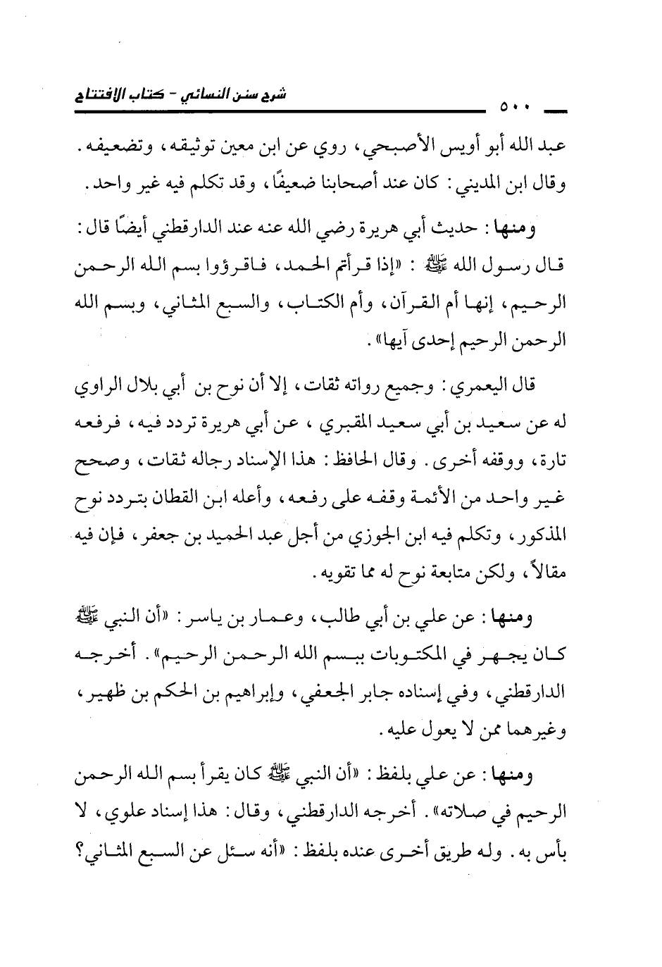ومنها: عن علي بلفظ: "أن النبي - صلى الله عليه وسلم - كان يقرأ بسم الله الرحمن الرحيم في صلاته". أخرجه الدارقطني، وقال: هذا إسناد علوي، لا بأس به. وله طريق أخرى عنده بلفظ: "أنه سئل عن السبع المثاني؟