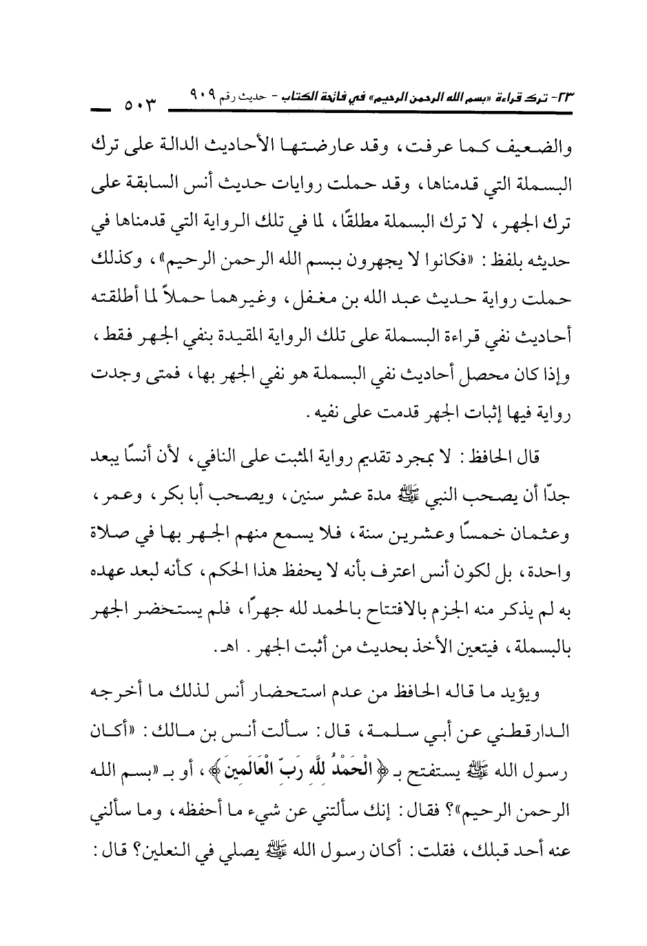 ويؤيد ما قاله الحافظ من عدم استحضار أنس لذلك ما أخرجه الدارقطني عن أبي سلمة، قال: سألت أنس بن مالك: "أكان رسول الله - صلى الله عليه وسلم - يستفتح بـ {الْحَمْدُ لِلَّهِ رَبِّ الْعَالَمِينَ}، أو بـ"بسم الله الرحمن الرحيم"؟ فقال: إنك سألتني عن شيء ما أحفظه، وما سألني عنه أحد قبلك، فقلت: أكان رسول الله - صلى الله عليه وسلم - يصلي في النعلين؟ قال:
