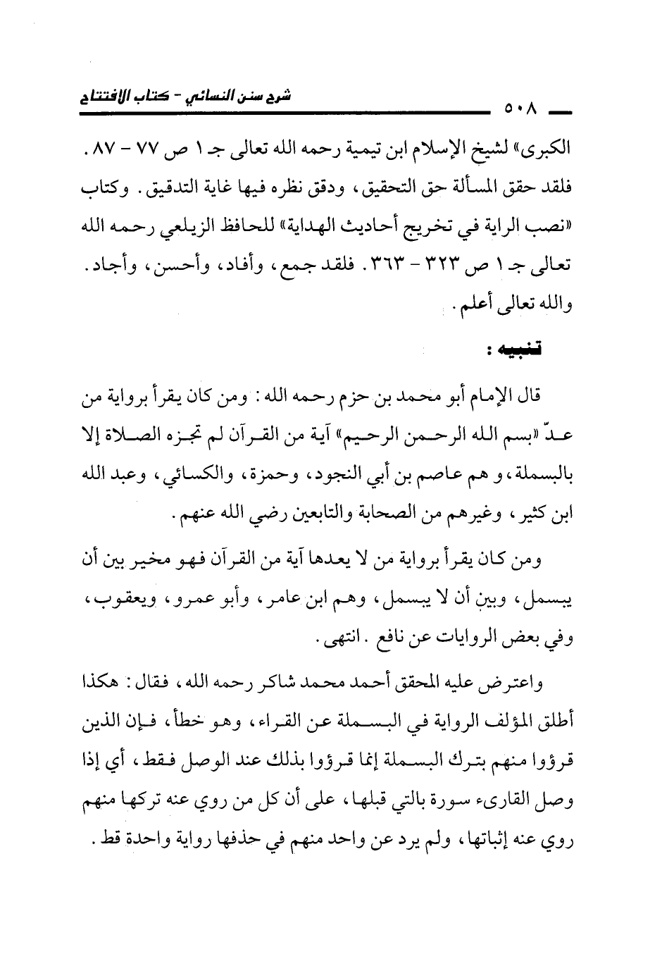 واعترض عليه المحقق أحمد محمد شاكر رحمه الله، فقال: هكذا أطلق المؤلف الرواية في البسملة عن القراء، وهو خطأ، فإن الذين