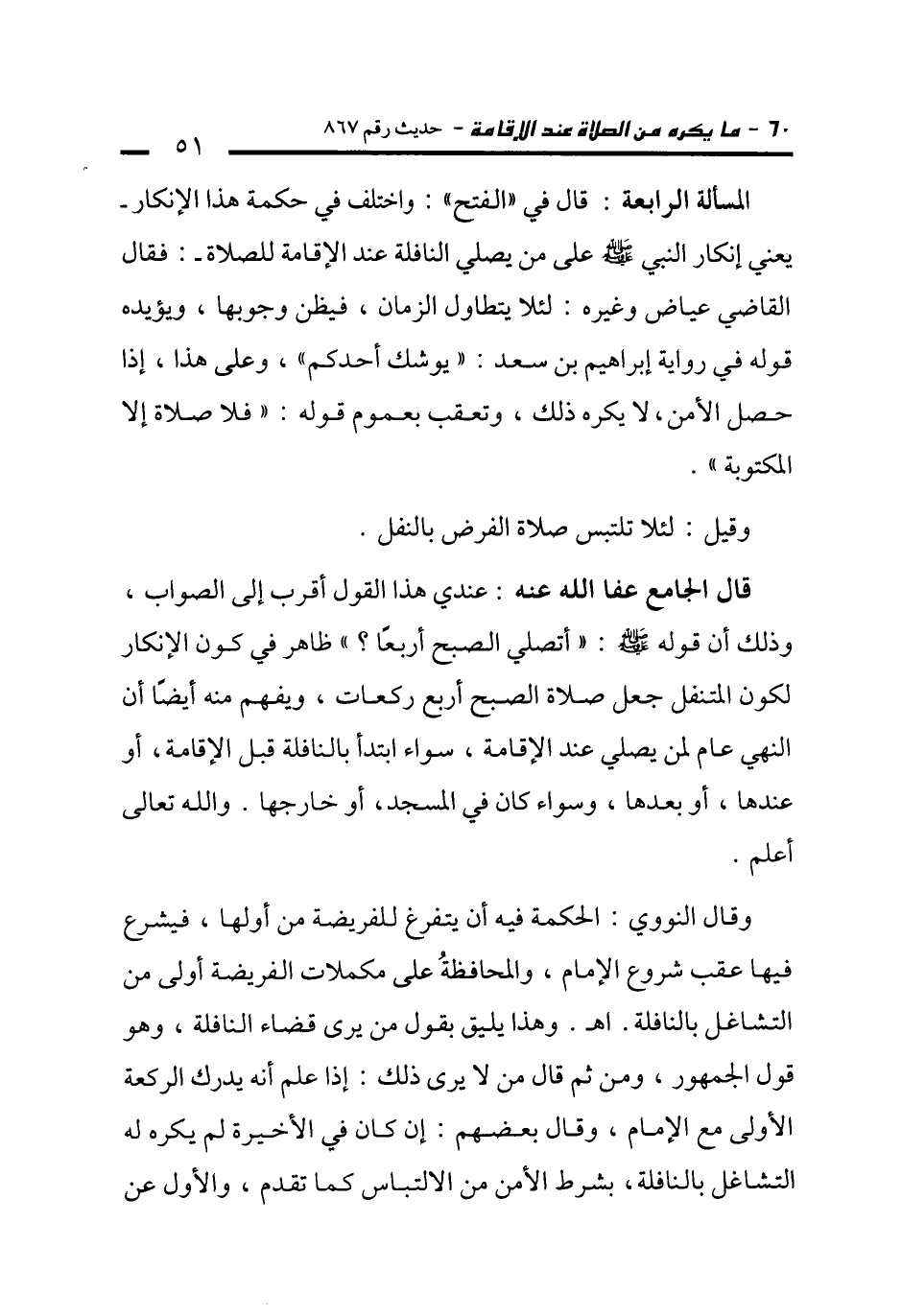 المسألة الرابعة: قال في "الفتح": واختلف في حكمة هذا الإنكار -يعني إنكار النبي -صلى الله عليه وسلم- على من يصلي النافلة عند الإقامة للصلاة-: فقال القاضي عياض وغيره: لئلا يتطاول الزمان، فيظن وجوبها، ويؤيده قوله في رواية إبراهيم بن سعد: "يوشك أحدكم"، وعلى هذا، إذا حصل الأمن، لا يكره ذلك، وتعقب بعموم قوله: "فلا صلاة إلا المكتوبة".