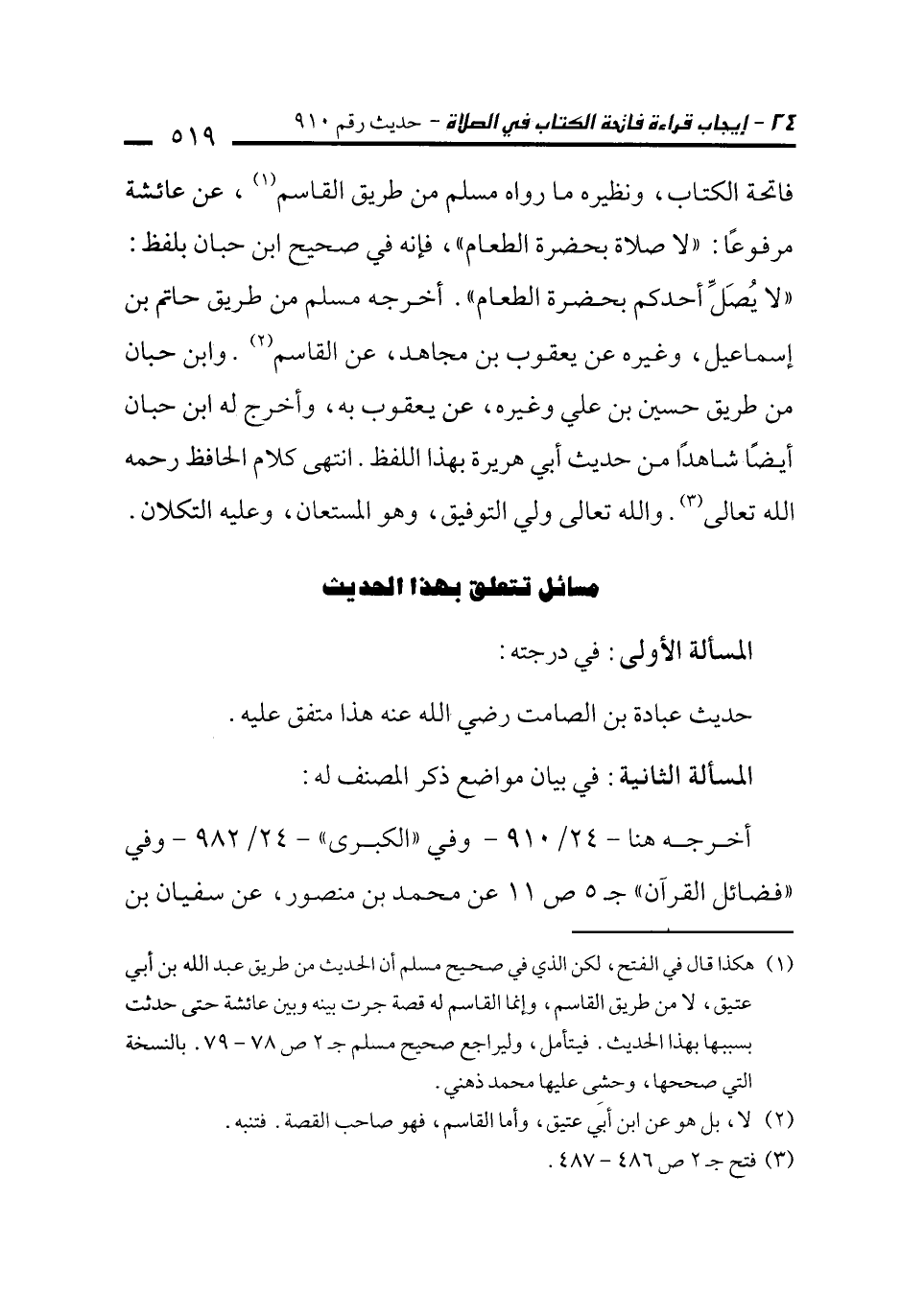 فاتحة الكتاب، ونظيره ما رواه مسلم من طريق القاسم (¬1)، عن عائشة مرفوعًا: "لا صلاة بحضرة الطعام"، فإنه في صحيح ابن حبان بلفظ: "لا يُصَلِّ أحدكم بحضرة الطعام". أخرجه مسلم من طريق حاتم بن إسماعيل، وغيره عن يعقوب بن مجاهد، عن القاسم (¬2). وابن حبان من طريق حسين بن علي وغيره، عن يعقوب به، وأخرج له ابن حبان أيضًا شاهدًا من حديث أبي هريرة بهذا اللفظ. انتهى كلام الحافظ رحمه الله تعالى (¬3). والله تعالى ولي التوفيق، وهو المستعان، وعليه التكلان.