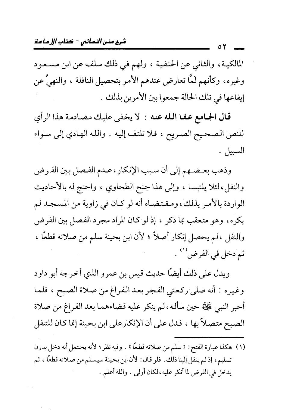 (¬1) هكذا عبارة الفتح: "سلم من صلاته قطعًا". وفيه نظر؛ لأنه يحتمل أنه دخل بدون تسليم، إذ لم ينقل إلينا ذلك. فلو قال: لأن ابن بحينة سيسلم من صلاته قطعًا، ثم يدخل في الفرض لما أنكر عليه، لكان أولى. والله أعلم.