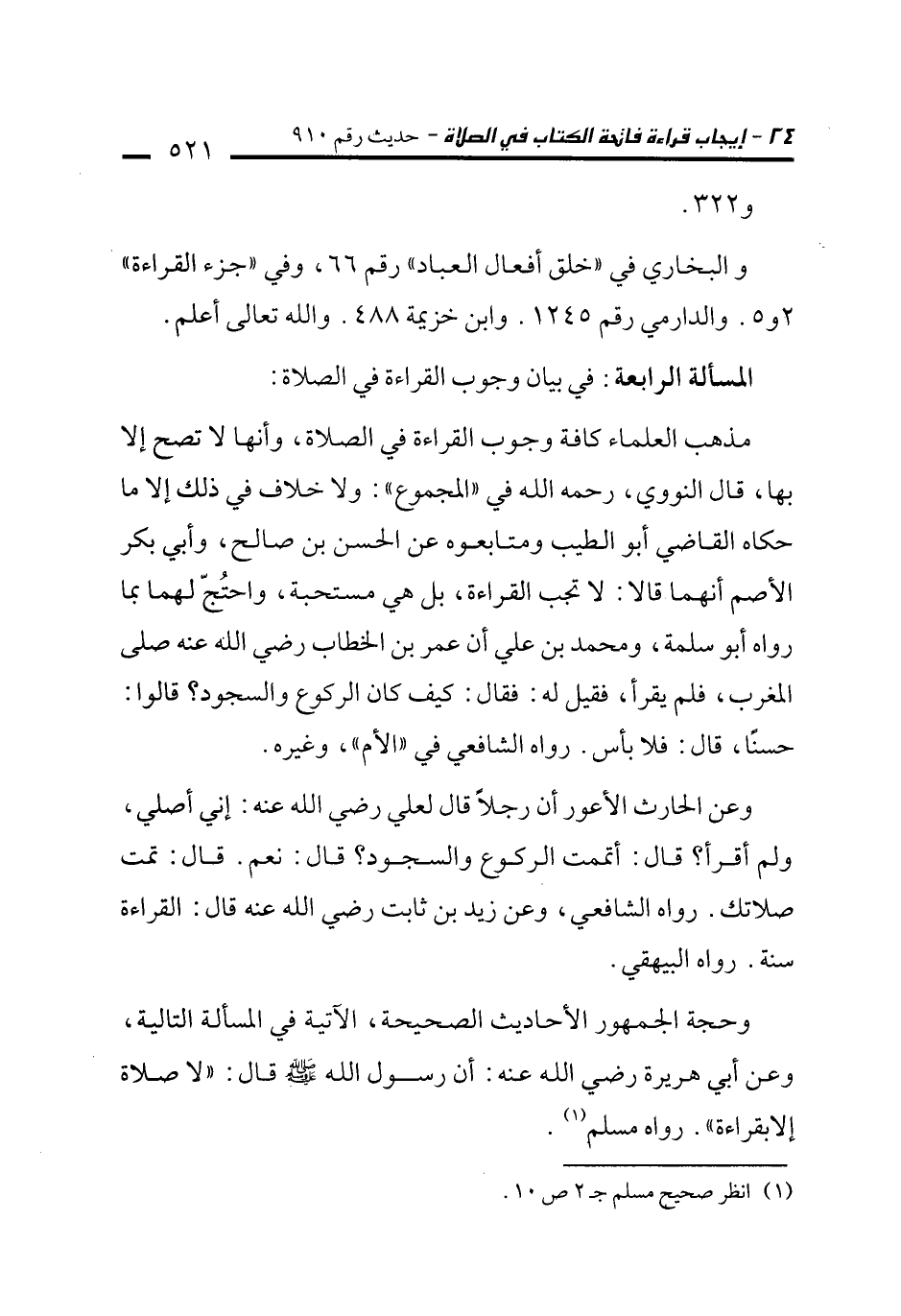 وحجة الجمهور الأحاديث الصحيحة، الآتية في المسألة التالية، وعن أبي هريرة رضي الله عنه: أن رسول - صلى الله عليه وسلم - قال: "لا صلاة إلا بقراءة". رواه مسلم (¬1).