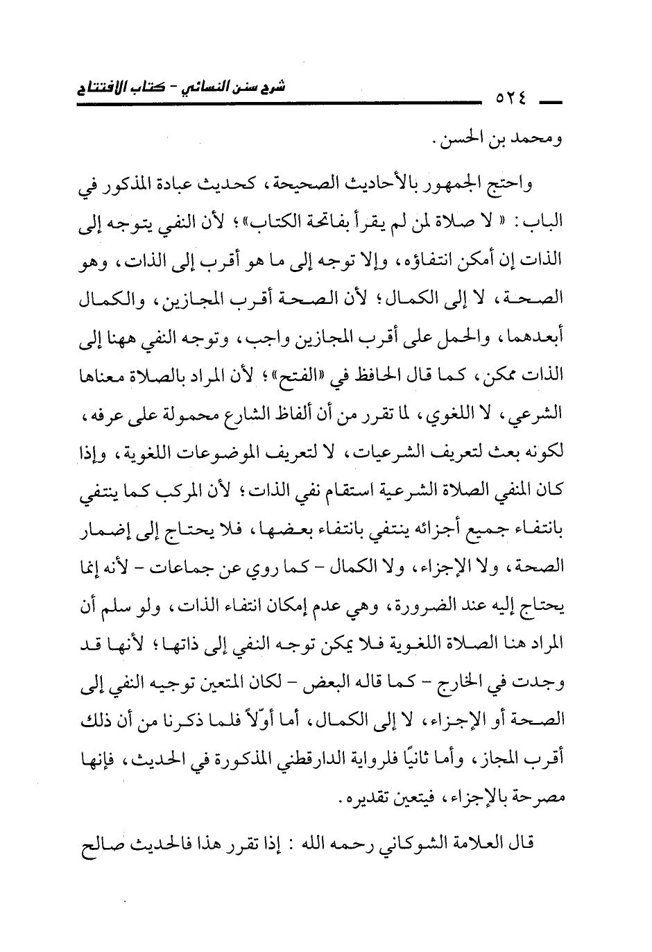 واحتج الجمهور بالأحاديث الصحيحة، كحديث عبادة المذكور في الباب: "لا صلاة لمن لم يقرأ بفاتحة الكتاب"؛ لأن النفي يتوجه إلى الذات إن أمكن انتفاؤه، وإلا توجه إلى ما هو أقرب إلى الذات، وهو الصحة، لا إلى الكمال؛ لأن الصحة أقرب المجازين، والكمال أبعدهما، والحمل على أقرب المجازين واجب، وتوجه النفي ههنا إلى الذات ممكن، كما قال الحافظ في "الفتح"؛ لأن المراد بالصلاة معناها الشرعي، لا اللغوي، لما تقرر من أن ألفاظ الشارع محمولة على عرفه، لكونه بعث لتعريف الشرعيات، لا لتعريف الموضوعات اللغوية، وإذا كان المنفي الصلاة الشرعية استقام نفي الذات؛ لأن المركب كما ينتفي بانتفاء جميع أجزائه ينتفي بانتفاء بعضها، فلا يحتاج إلى إضمار الصحة، ولا الإجزاء، ولا الكمال -كما روي عن جماعات- لأنه إنما يحتاج إليه عند الضرورة، وهي عدم إمكان انتفاء الذات، ولو سلم أن المراد هنا الصلاة اللغوية فلا يمكن توجه النفي إلى ذاتها؛ لأنها قد وجدت في الخارج -كما قاله البعض- لكان المتعين توجيه النفي إلى الصحة أو الإجزاء، لا إلى الكمال، أما أوّلًا فلما ذكرنا من أن ذلك أقرب المجاز، وأما ثانيًا فلرواية الدارقطني المذكورة في الحديث، فإنها مصرحة بالإجزاء، فيتعين تقديره.