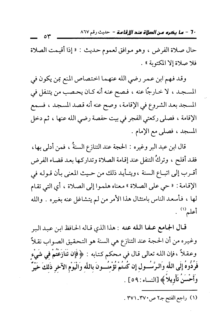 قال الجامع عفا الله عنه: هذا الذي قاله الحافظ ابن عبد البر وغيره من أن الحجة عند التنازع هي السنة هو التحقيق الصواب نقلاً وعقلاً، فإن الله تعالى قال في محكم كتابه: {فَإِنْ تَنَازَعْتُمْ فِي شَيْءٍ فَرُدُّوهُ إِلَى اللَّهِ وَالرَّسُولِ إِنْ كُنْتُمْ تُؤْمِنُونَ بِاللَّهِ وَالْيَوْمِ الْآخِرِ ذَلِكَ خَيْرٌ وَأَحْسَنُ تَأْوِيلًا} [النساء: 59].
