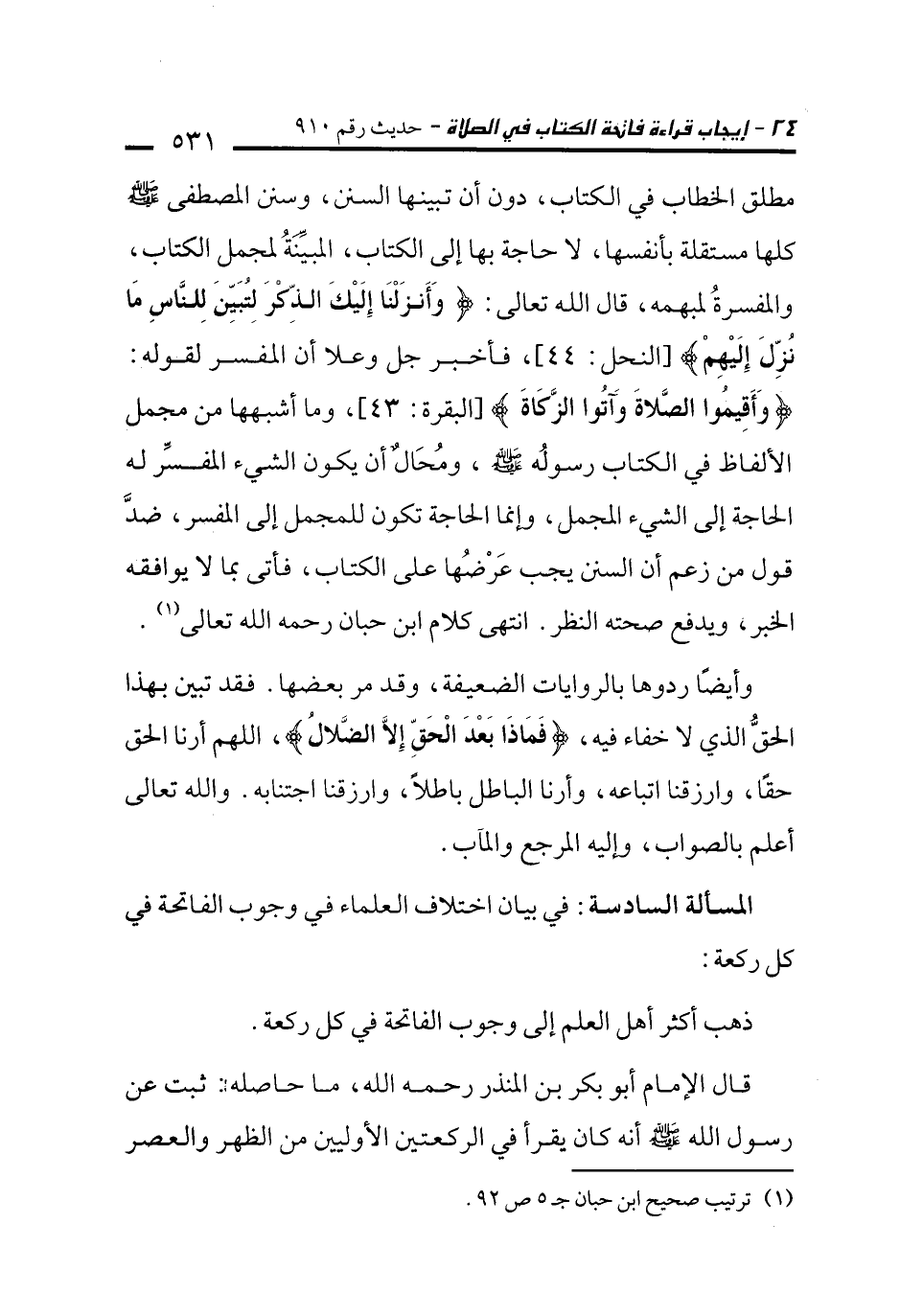 المسألة السادسة: في بيان اختلاف العلماء في وجوب الفاتحة في كل ركعة:
