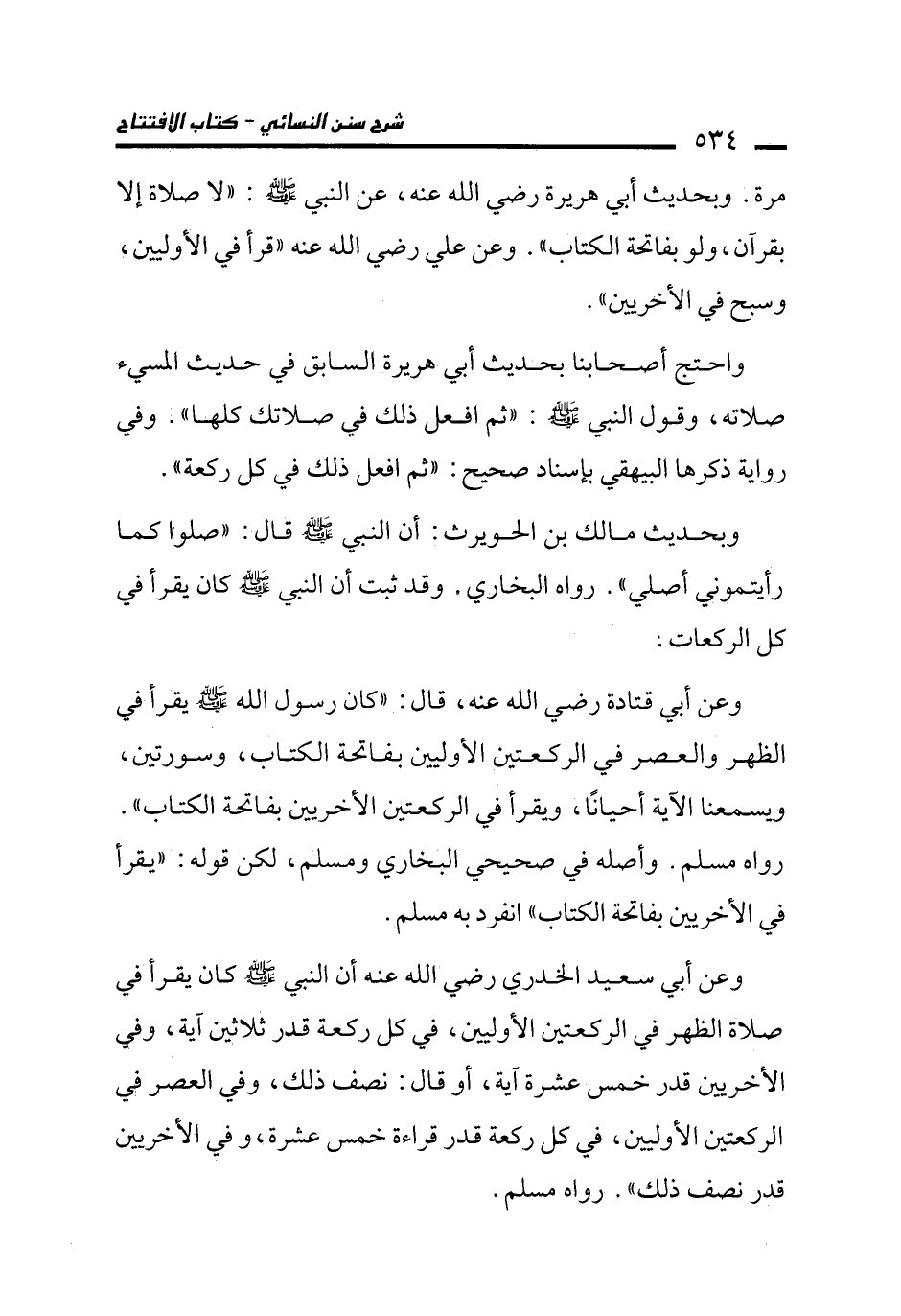 مرة. وبحديث أبي هريرة رضي الله عنه، عن النبي - صلى الله عليه وسلم -: "لا صلاة إلا بقرآن، ولو بفاتحة الكتاب". وعن علي رضي الله عنه "قرأ في الأوليين، وسبح في الأخريين".