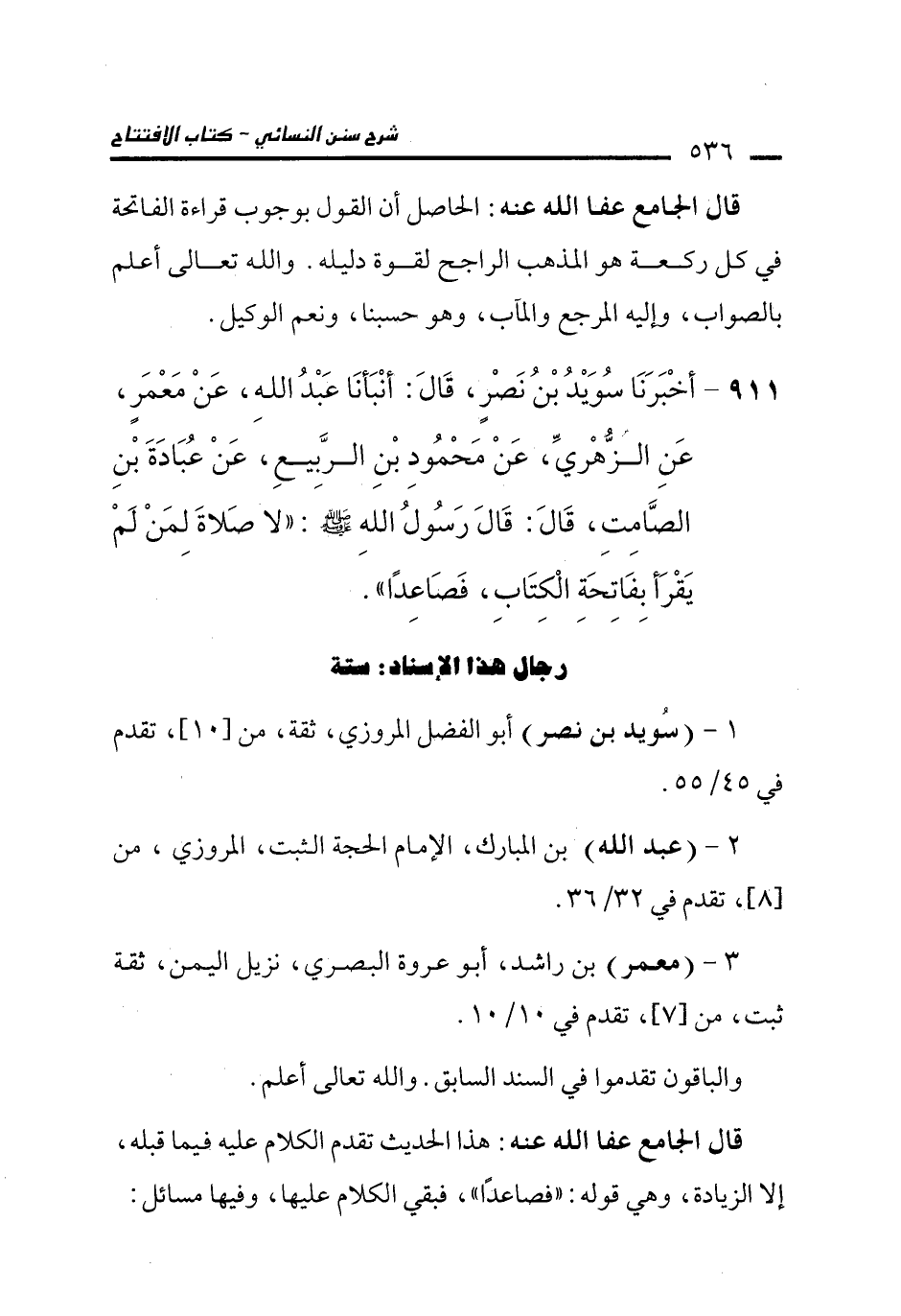 911 - أَخْبَرَنَا سُوَيْدُ بْنُ نَصْرٍ، قَالَ: أَنْبَأَنَا عَبْدُ اللَّهِ، عَنْ مَعْمَرٍ، عَنِ الزُّهْرِيِّ، عَنْ مَحْمُودِ بْنِ الرَّبِيعِ، عَنْ عُبَادَةَ بْنِ الصَّامِتِ، قَالَ: قَالَ رَسُولُ اللَّهِ - صلى الله عليه وسلم -: "لاَ صَلاَةَ لِمَنْ لَمْ يَقْرَأْ بِفَاتِحَةِ الْكِتَابِ فَصَاعِدًا".