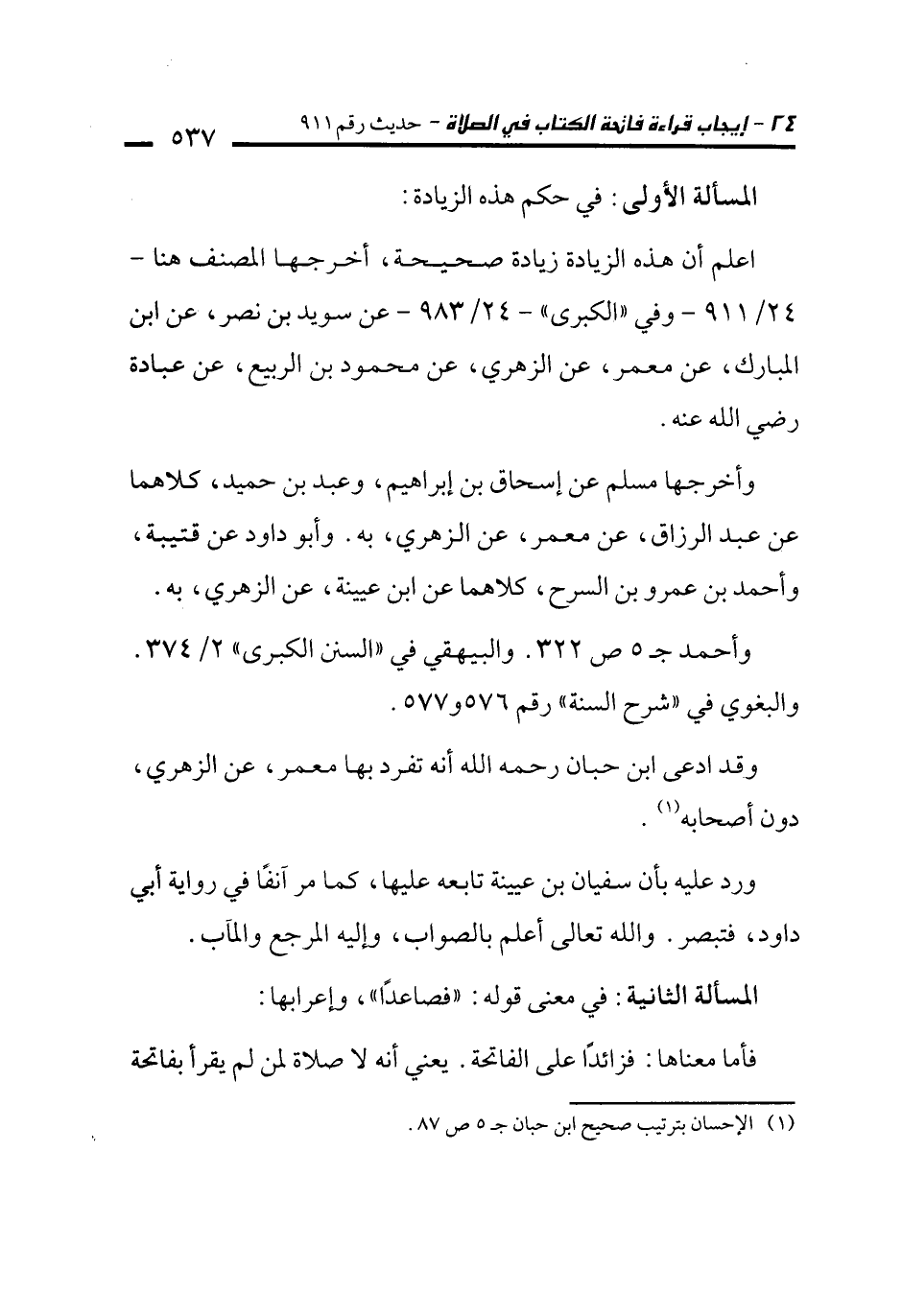اعلم أن هذه الزيادة زيادة صحيحة، أخرجها المصنف هنا -24/ 911 - وفي "الكبرى" -24/ 983 - عن سويد بن نصر، عن ابن المبارك، عن معمر، عن الزهري، عن محمود بن الربيع، عن عبادة رضي الله عنه.