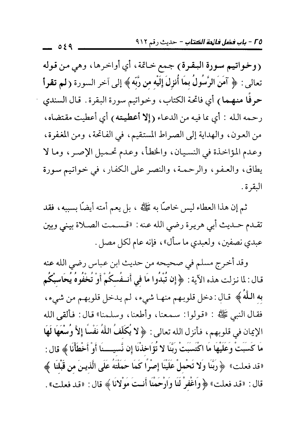 وقد أخرج مسلم في صحيحه من حديث ابن عباس رضي الله عنه قال: لما نزلت هذه الآية: {إِنْ تُبْدُوا مَا فِي أَنْفُسِكُمْ أَوْ تُخْفُوهُ يُحَاسِبْكُمْ بِهِ اللَّهُ} قال: دخل قلوبهم منها شيء، لم يدخل قلوبهم من شيء، فقال النبي - صلى الله عليه وسلم -: "قولوا: سمعنا، وأطعنا، وسلمنا" قال: فألقى الله الإيمان في قلوبهم، فأنزل الله تعالى: {لَا يُكَلِّفُ اللَّهُ نَفْسًا إِلَّا وُسْعَهَا لَهَا مَا كَسَبَتْ وَعَلَيْهَا مَا اكْتَسَبَتْ رَبَّنَا لَا تُؤَاخِذْنَا إِنْ نَسِينَا أَوْ أَخْطَأْنَا} قال: "قد فعلت" {رَبَّنَا وَلَا تَحْمِلْ عَلَيْنَا إِصْرًا كَمَا حَمَلْتَهُ عَلَى الَّذِينَ مِنْ قَبْلِنَا} قال: "قد فعلت" {وَاغْفِرْ لَنَا وَارْحَمْنَا أَنْتَ مَوْلَانَا} قال: "قد فعلت".