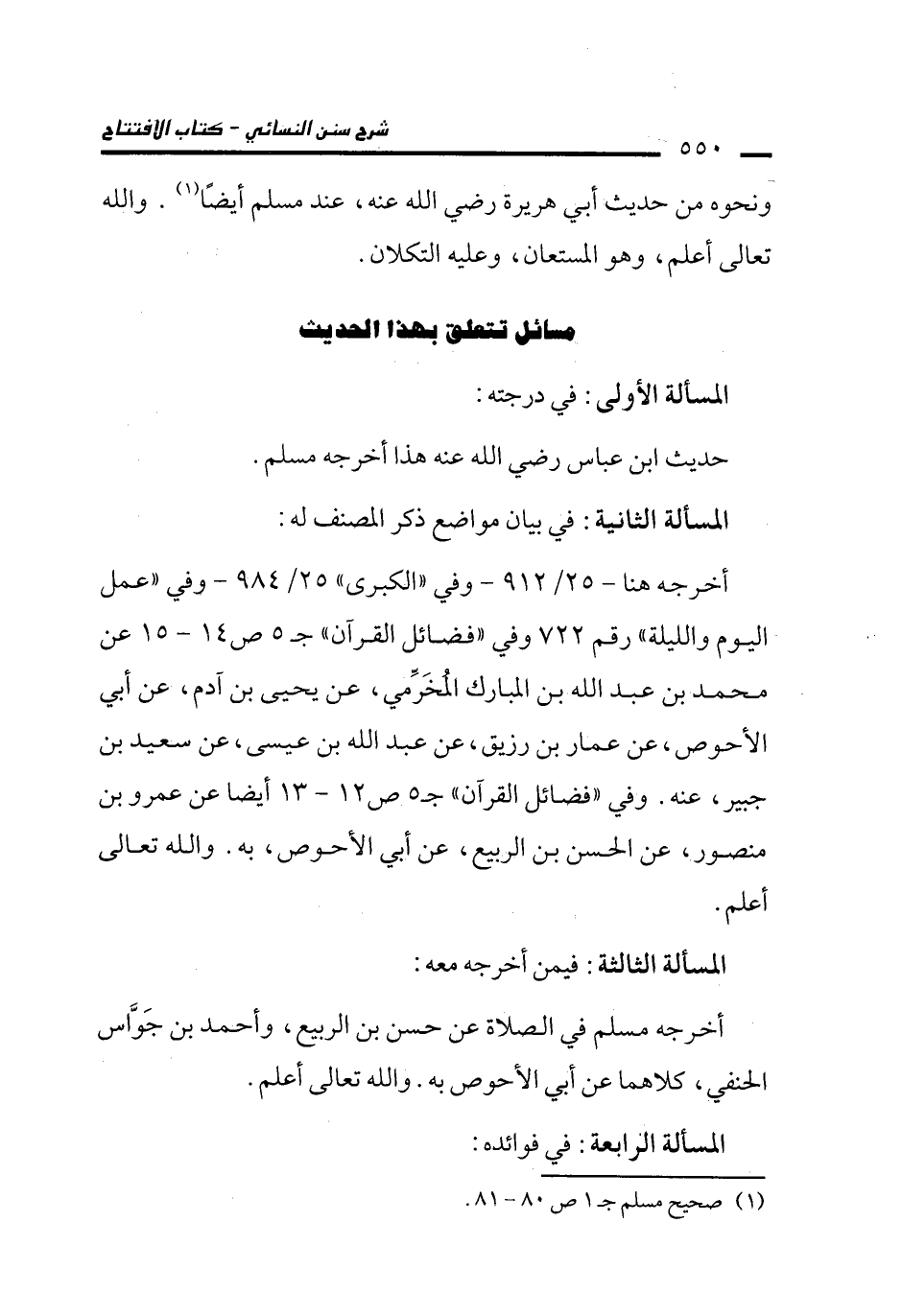 أخرجه هنا -25/ 912 - وفي "الكبرى" 25/ 984 - وفي "عمل اليوم والليلة" رقم 722 وفي "فضائل القرآن" جـ 5 ص 14 - 15 عن محمد بن عبد الله بن المبارك المُخَرِّمي، عن يحيى بن آدم، عن أبي الأحوص، عن عمار بن رزيق، عن عبد الله بن عيسى، عن سعيد بن جبير، عنه. وفي "فضائل القرآن" جـ 5 ص 12 - 13 أيضا عن عمرو بن منصور، عن الحسن بن الربيع، عن أبي الأحوص، به. والله تعالى أعلم.