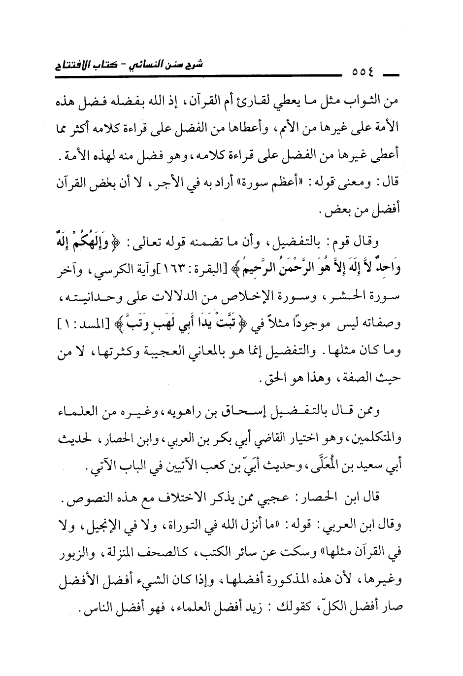 وقال ابن العربي: قوله: "ما أنزل الله في التوراة، ولا في الإنجيل، ولا في القرآن مثلها" وسكت عن سائر الكتب، كالصحف المنزلة، والزبور وغيرها، لأن هذه المذكورة أفضلها، وإذا كان الشيء أفضل الأفضل صار أفضل الكلّ، كقولك: زيد أفضل العلماء، فهو أفضل الناس.