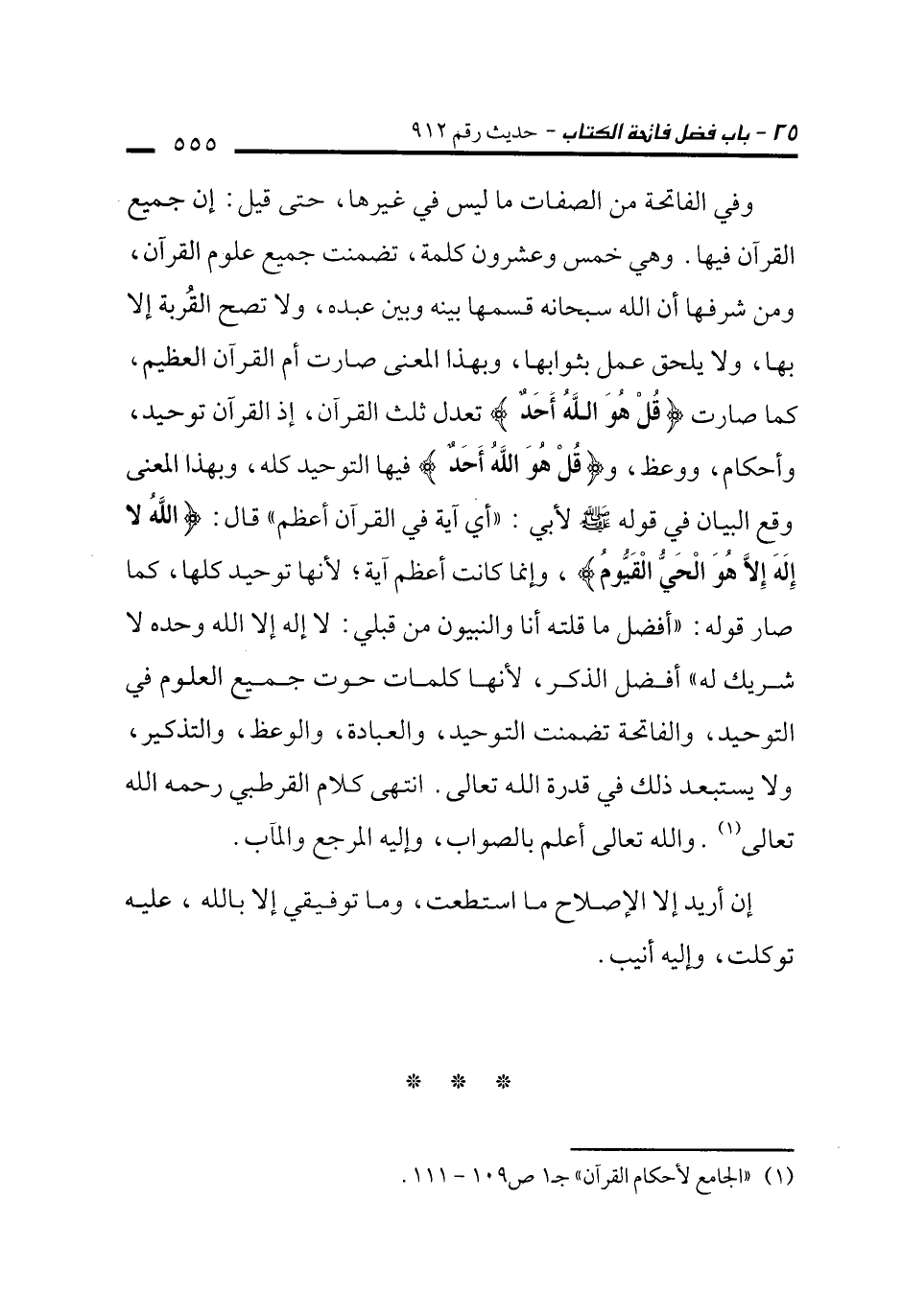 وفي الفاتحة من الصفات ما ليس في غيرها، حتى قيل: إن جميع القرآن فيها. وهي خمس وعشرون كلمة، تضمنت جميع علوم القرآن، ومن شرفها أن الله سبحانه قسمها بينه وبين عبده، ولا تصح القُربة إلا بها، ولا يلحق عمل بثوابها، وبهذا المعنى صارت أم القرآن العظيم، كما صارت {قُلْ هُوَ اللَّهُ أَحَدٌ} تعدل ثلث القرآن، إذ القرآن توحيد، وأحكام، ووعظ، و {قُلْ هُوَ اللَّهُ أَحَدٌ} فيها التوحيد كله، وبهذا المعنى وقع البيان في قوله - صلى الله عليه وسلم - لأبي: "أي آية في القرآن أعظم" قال: {اللَّهُ لَا إِلَهَ إِلَّا هُوَ الْحَيُّ الْقَيُّومُ}، وإنما كانت أعظم آية، لأنها توحيد كلها، كما صار قوله: "أفضل ما قلته أنا والنبيون من قبلي: لا إله إلا الله وحده لا شريك له" أفضل الذكر، لأنها كلمات حوت جميع العلوم في التوحيد، والفاتحة تضمنت التوحيد، والعبادة، والوعظ، والتذكير، ولا يستبعد ذلك في قدرة الله تعالى. انتهى كلام القرطبي رحمه الله تعالى (¬1). والله تعالى أعلم بالصواب، وإليه المرجع والمآب.