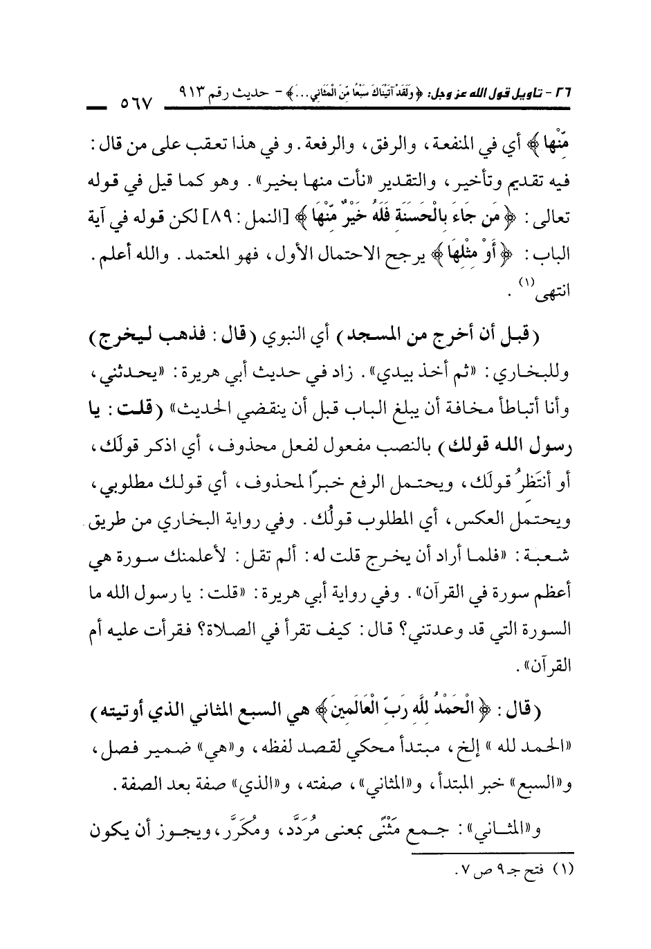 (قال: {الْحَمْدُ لِلَّهِ رَبِّ الْعَالَمِينَ} هي السبع المثاني الذي أوتيته) "الحمد لله" إلخ، مبتدأ محكي لقصد لفظه، و"هي" ضمير فصل، و"السبع" خبر المبتدأ، و"المثاني"، صفته، و"الذي" صفة بعد الصفة.