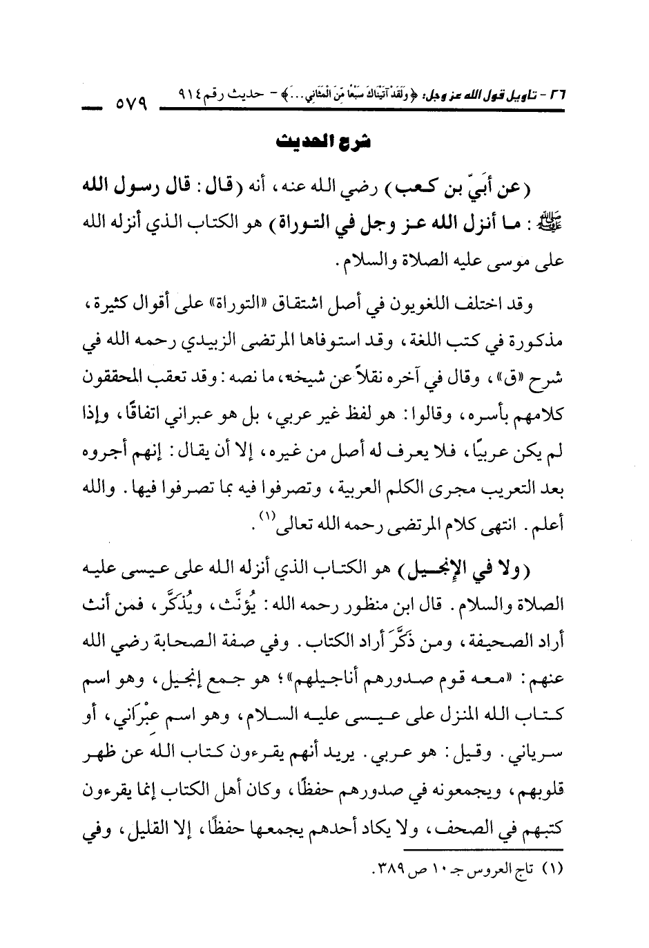 وقد اختلف اللغويون في أصل اشتقاق "التوراة" على أقوال كثيرة، مذكورة في كتب اللغة، وقد استوفاها المرتضى الزبيدي رحمه الله في شرح "ق"، وقال في آخره نقلًا عن شيخه، ما نصه: وقد تعقب المحققون كلامهم بأسره، وقالوا: هو لفظ غير عربي، بل هو عبراني اتفاقًا، وإذا لم يكن عربيًا، فلا يعرف له أصل من غيره، إلا أن يقال: إنهم أجروه بعد التعريب مجرى الكلم العربية، وتصرفوا فيه بما تصرفوا فيها. والله أعلم. انتهى كلام المرتضى رحمه الله تعالى (¬1).