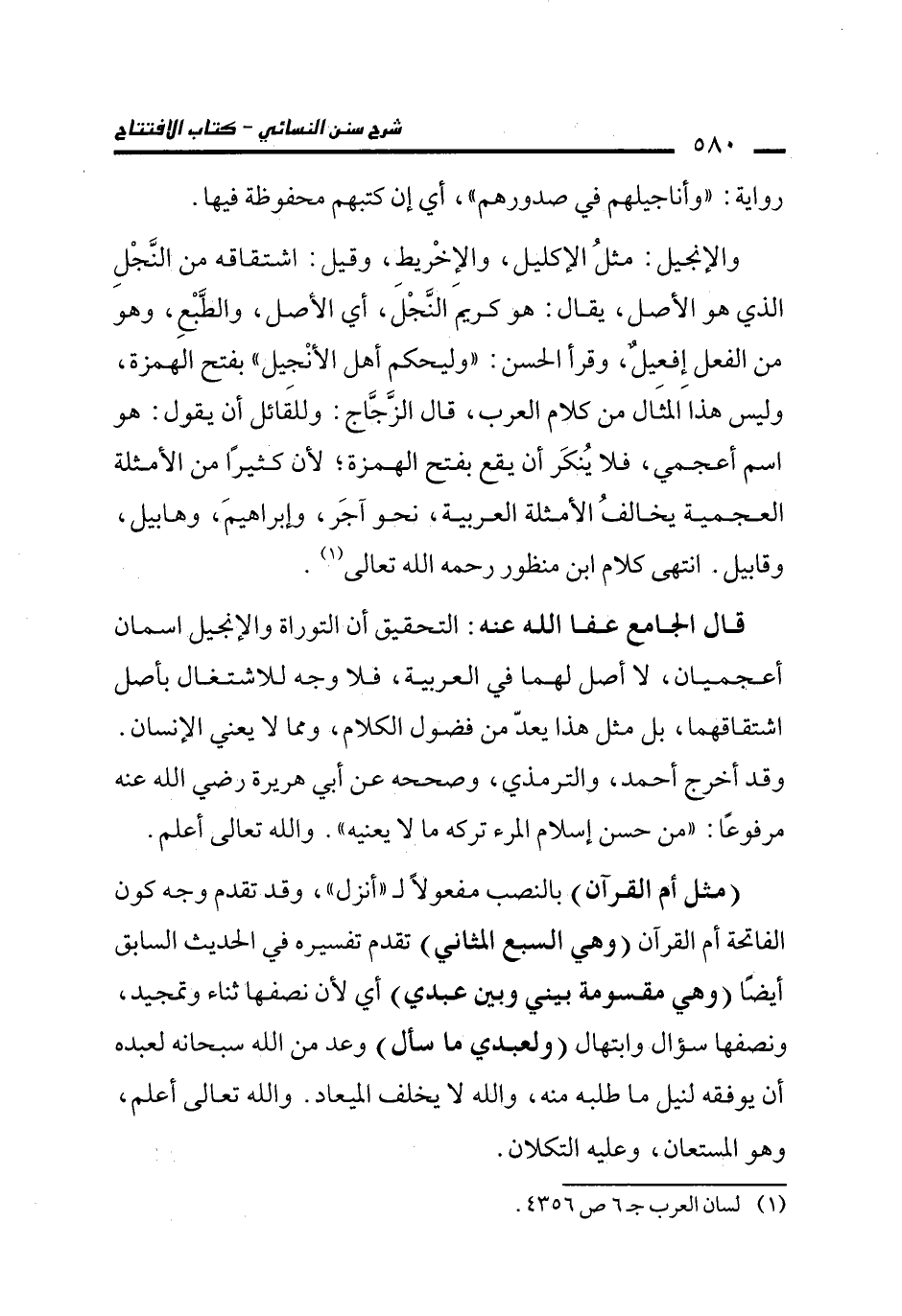 قال الجامع عفا الله عنه: التحقيق أن التوراة والإنجيل اسمان أعجميان، لا أصل لهما في العربية، فلا وجه للاشتغال بأصل اشتقاقهما، بل مثل هذا يعدّ من فضول الكلام، ومما لا يعني الإنسان. وقد أخرج أحمد، والترمذي، وصححه عن أبي هريرة رضي الله عنه مرفوعًا: "من حسن إسلام المرء تركه ما لا يعنيه". والله تعالى أعلم.